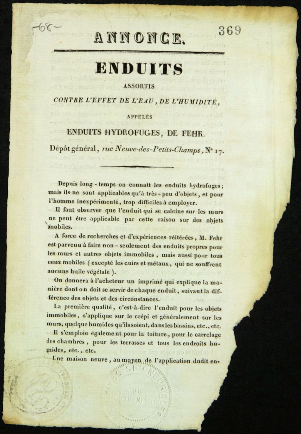 - Annonce. Enduits assortis contre l'effet de l'eau, de l'humidité appelée enduits hydrofuges, de [Salomon] Fehr