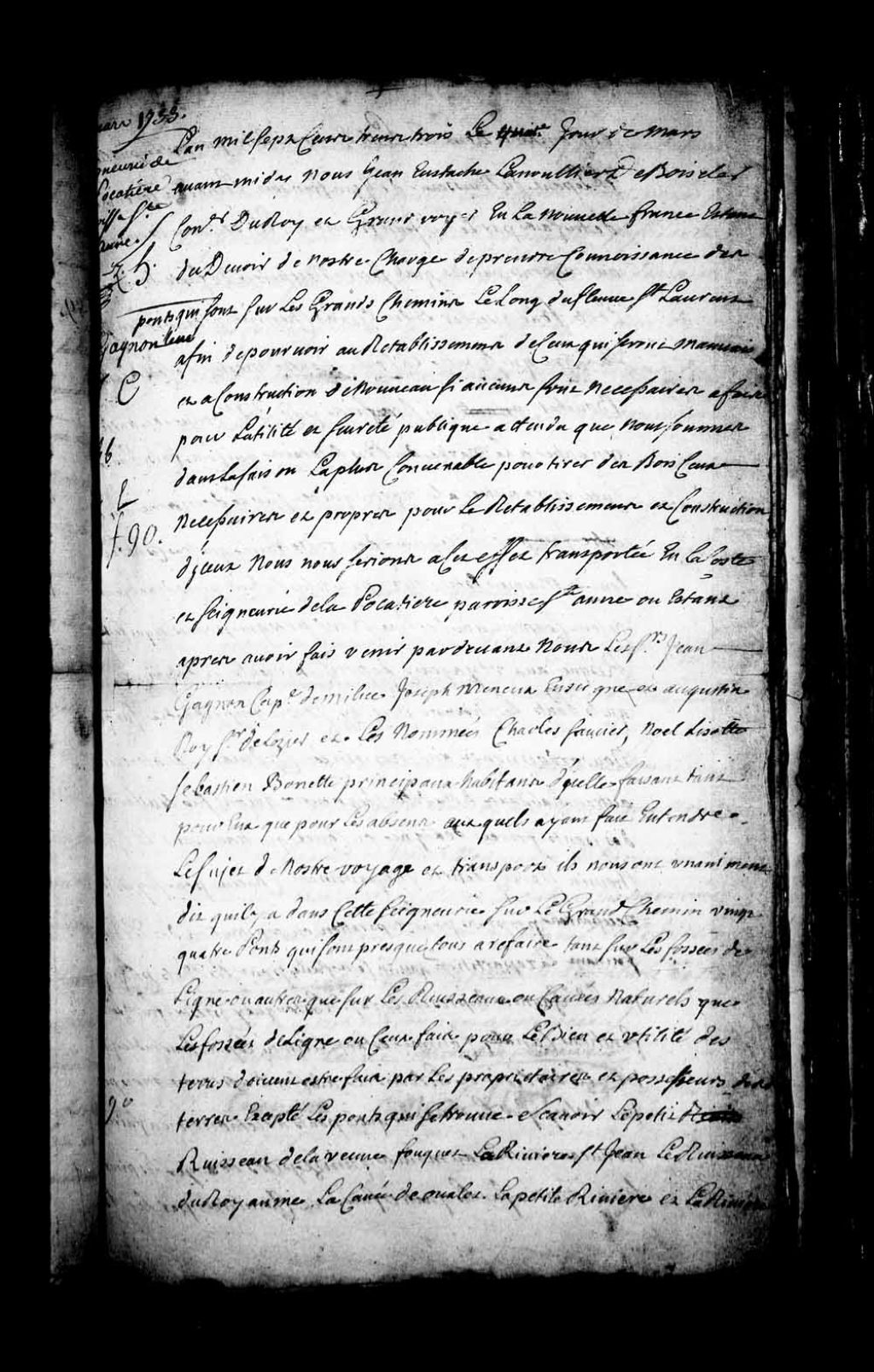 Procès-verbal de Jean-Eustache Lanouillier de Boiscler au sujet des ponts de la seigneurie de la Pocatière, paroisse Sainte-Anne (Sainte-Anne-de-la-Pocatière), 4 mars 1733, Archives nationales à Québec, Fonds Grands voyers, (03Q,E2,S1,D150,P132).