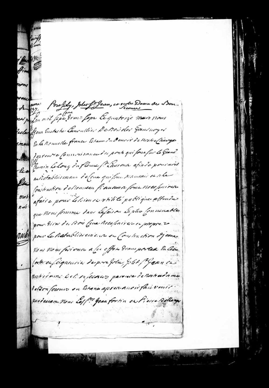 Procès-verbal de Jean-Eustache Lanouillier de Boiscler qui ordonne aux habitants de Port-Joli, Islet Saint-Jean et Notre-Dame-de-Bonsecours qui sont en défaut pour la construction des ponts qui sont sur leurs terres de tirer d'ici à huit jours les bois nécessaires pour ces constructions, 14 mars 1737, Archives nationales à Québec, Fonds Grands voyers, (03Q,E2,S1,D150,P169).