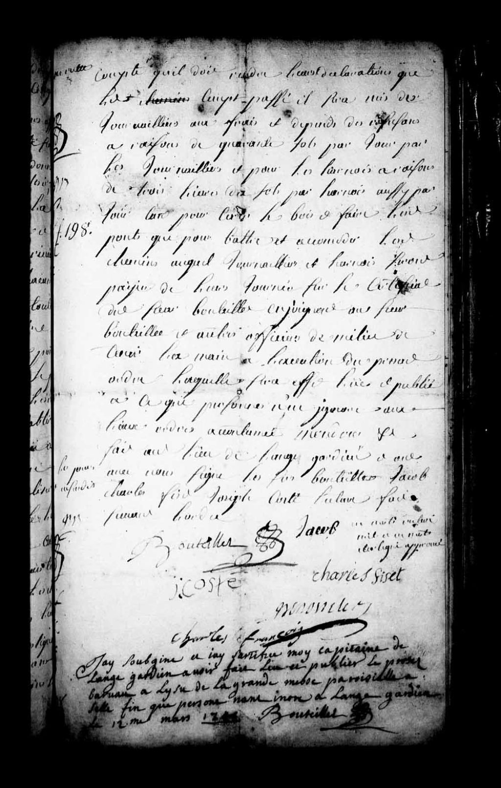 Le capitaine de l'Ange-Gardien affirme avoir publié le procès-verbal de Jean-Eustache Lanouillier de Boiscler du 10 mars 1741 pour la réparation des ponts de la paroisse de l'Ange-Gardien, côte de Beaupré
