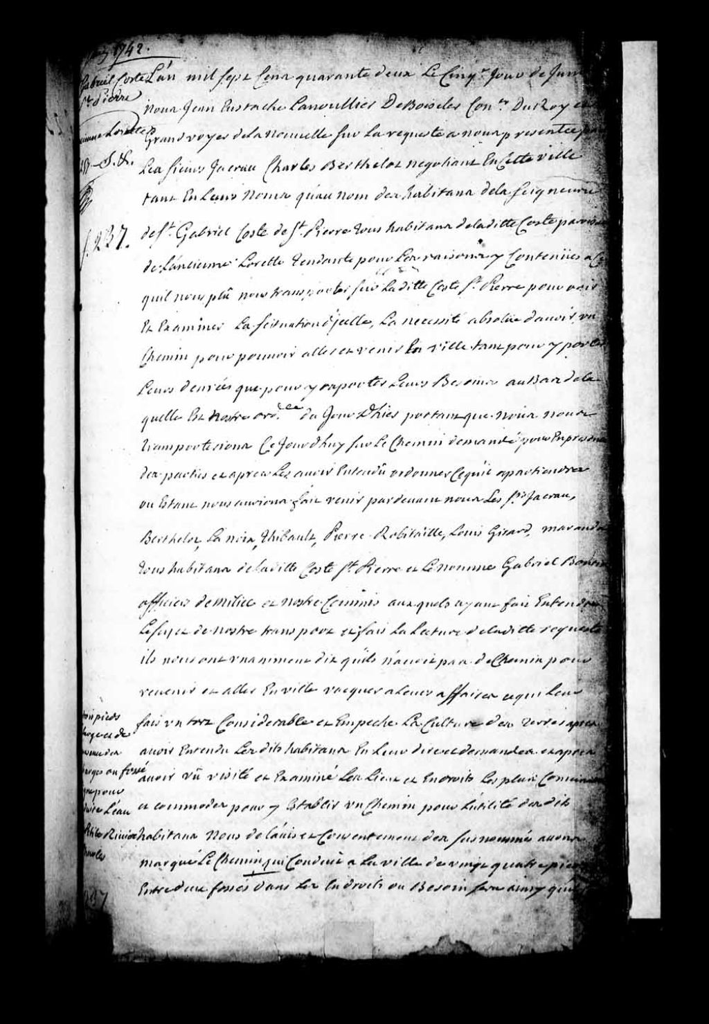 Procès-verbal de Jean-Eustache Lanouillier de Boiscler qui marque le chemin qui conduit de Saint-Gabriel, côte Saint-Pierre, seigneurie de l'Ancienne-Lorette, à la ville de Québec, et décide qu'il aura vingt-quatre pieds de largeur, 5 juin 1742, Archives nationales à Québec, Fonds Grands voyers, (03Q,E2,S1,D150,P199).
