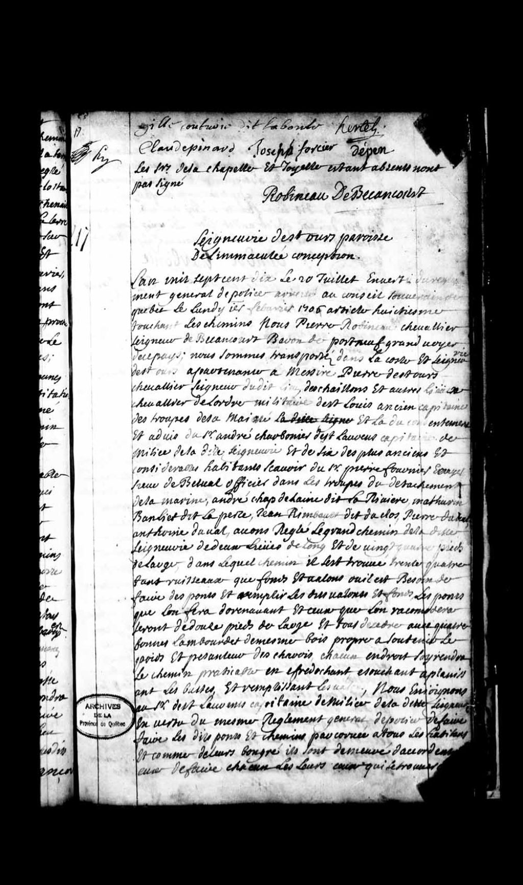 Procès-verbal de Pierre Robineau de Bécancour pour le grand chemin de la côte et seigneurie de Saint-Ours appartenant à messire Pierre de Saint-Ours, chevalier de Saint-Louis, ancien capitaine des troupes du détachement de la marine, 20 juillet 1710, Archives nationales à Québec, Fonds Grands voyers, (03Q,E2,S1,D150,P21).