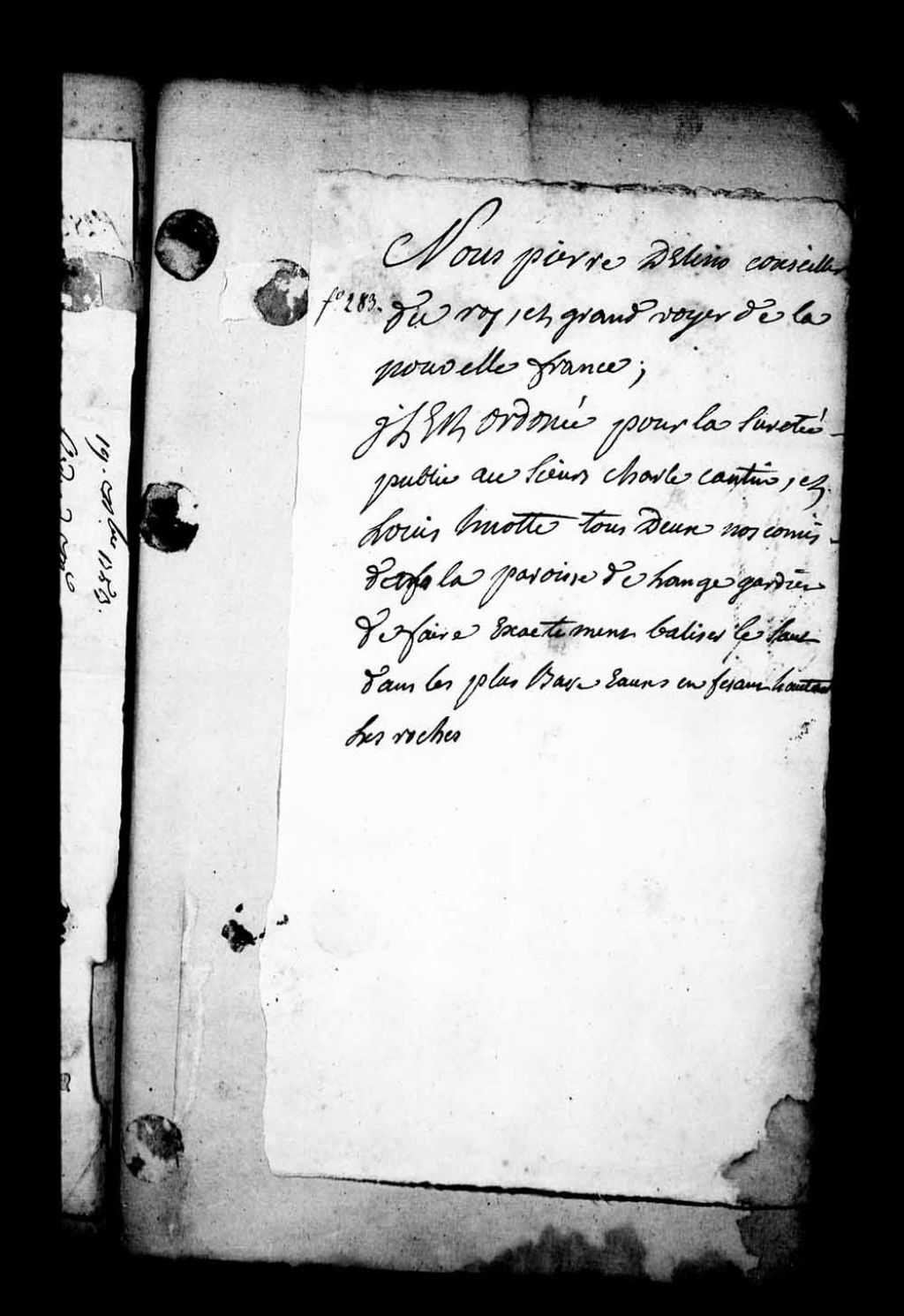 Procès-verbal de Pierre de Lino qui ordonne de faire baliser le dans la paroisse de l'Ange-Gardien, 24 septembre 1753-17 août 1758, Archives nationales à Québec, Fonds Grands voyers, (03Q,E2,S1,D150,P218).