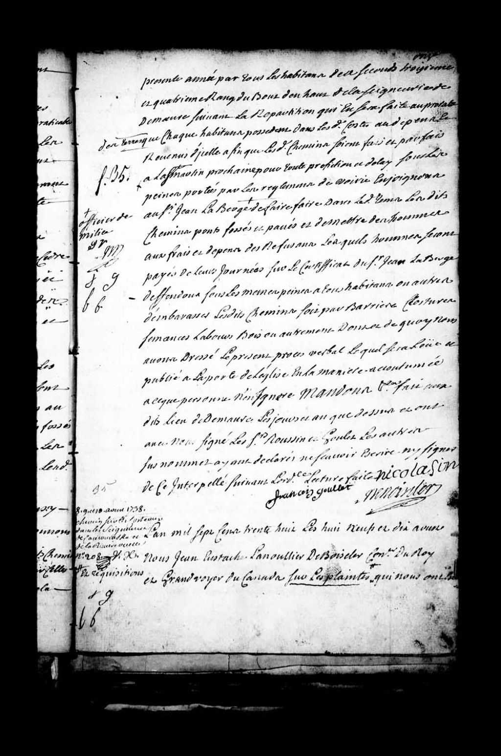 - Procès-verbal de Jean-Eustache Lanouillier de Boiscler qui marque un chemin royal de vingt-quatre pieds de largeur par-dessus les coteaux pour la sûreté des habitants de Kamouraska et de la Rivière-Ouelle sur toute l'étendue des dites deux seigneuries et pour que la communication soit plus facile