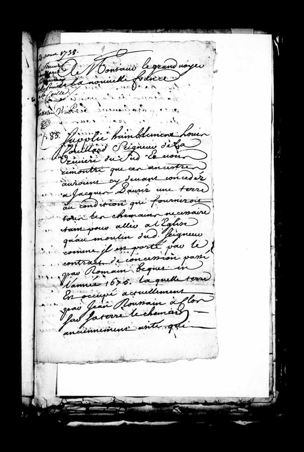 Procès-verbal de Jean-Eustache Lanouillier de Boiscler qui ordonne que Jean Roussin, habitant de la Rivière-du-Sud, livrera et entretiendra sur le travers de sa terre un chemin de charrette pour l'utilité de M. Couillard, seigneur de la Pointe-à-la-Caille et de la Rivière-du-Sud, 21 novembre 1738, Archives nationales à Québec, Fonds Grands voyers, (03Q,E2,S1,D150,P246).