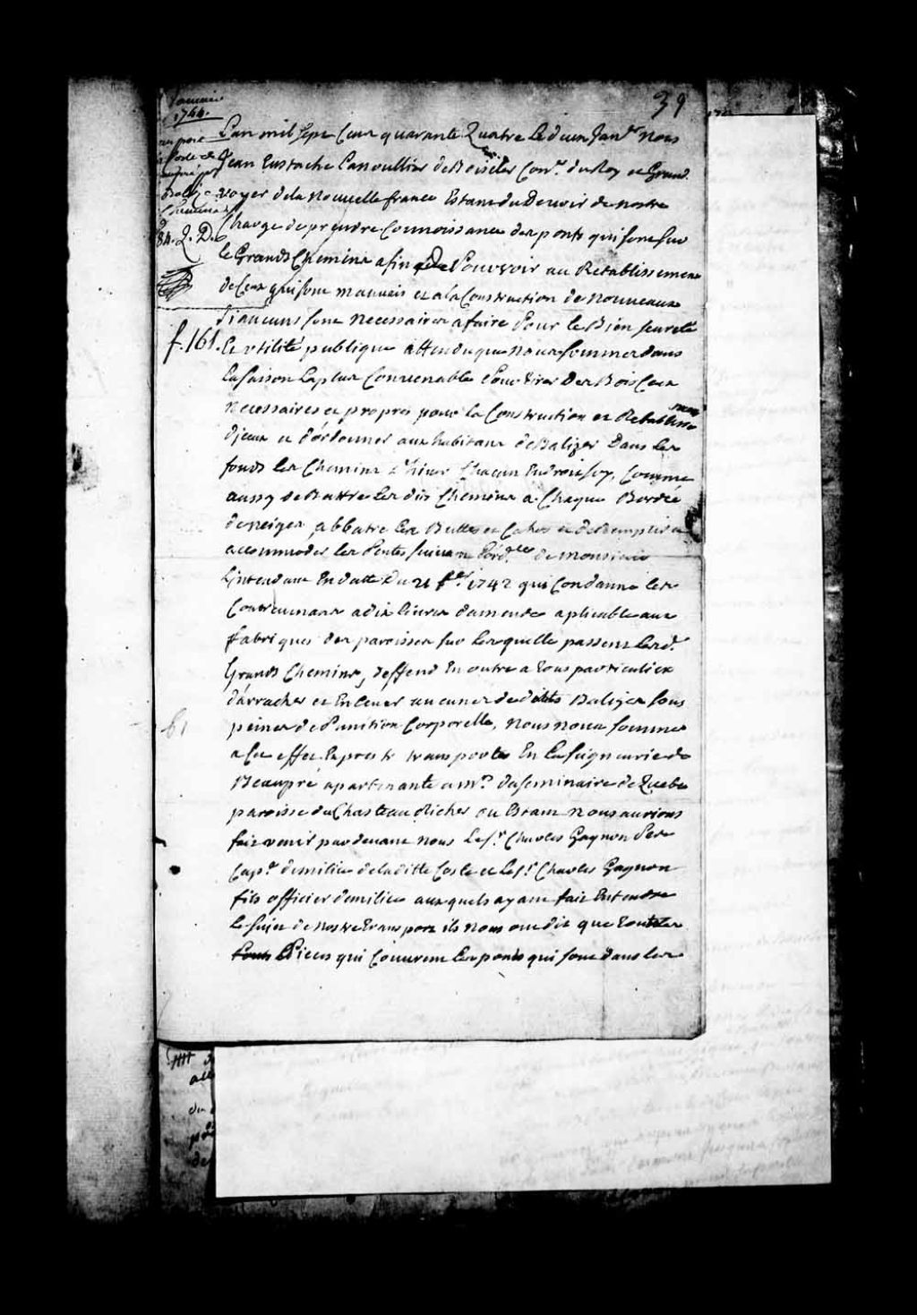 Procès-verbal de Jean-Eustache Lanouillier de Boiscler qui ordonne aux habitants de la côte de Beaupré de baliser chacun en droit soi les chemins d'hiver, 2 janvier 1744, Archives nationales à Québec, Fonds Grands voyers, (03Q,E2,S1,D150,P280).