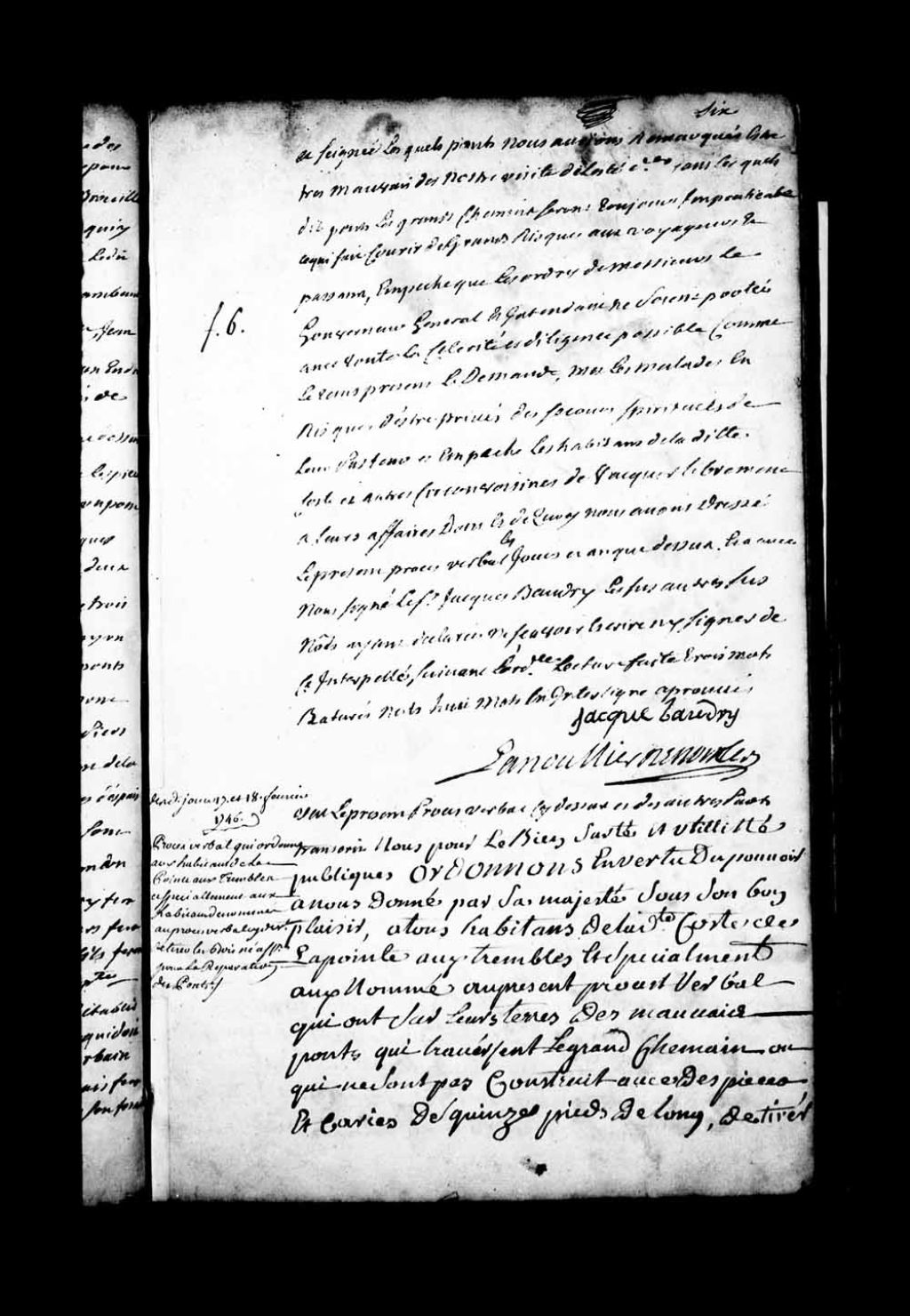 Procès-verbal de Jean-Eustache Lanouillier de Boiscler qui ordonne aux habitants de la Pointe-aux-Trembles, île de Montréal, spécialement à ceux dénommés au procès-verbal précédent, de tirer les bois nécessaires pour la construction et réparation des ponts avariés, 17 février 1746-18 février 1746, Archives nationales à Québec, Fonds Grands voyers, (03Q,E2,S1,D150,P356).