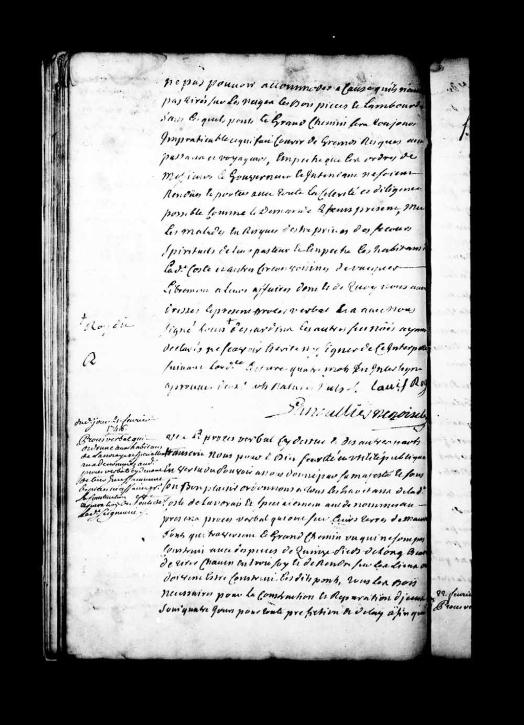 Procès-verbal de Jean-Eustache Lanouillier de Boiscler qui ordonne aux: habitants de Lanoraie, principalement à ceux dénommés au procès-verbal précédent, de tirer incessamment les pièces nécessaires pour la construction et réparation des ponts de la dite côte et seigneurie, 21 février 1746, Archives nationales à Québec, Fonds Grands voyers, (03Q,E2,S1,D150,P364).
