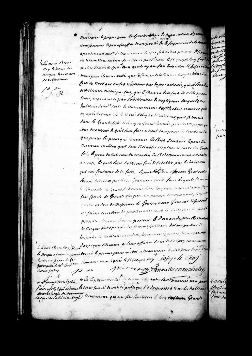 Procès-verbal de Jean-Eustache Lanouillier de Boiscler qui ordonne aux habitants de Beaumont, à ceux de la Rivière-Boyer et de Ville-Marie, notamment aux dénommés au procès-verbal précédent de tirer incessamment les pièces de bois nécessaires pour la construction et réparation des ponts des dits lieux, 1er avril 1746, Archives nationales à Québec, Fonds Grands voyers, (03Q,E2,S1,D150,P390).