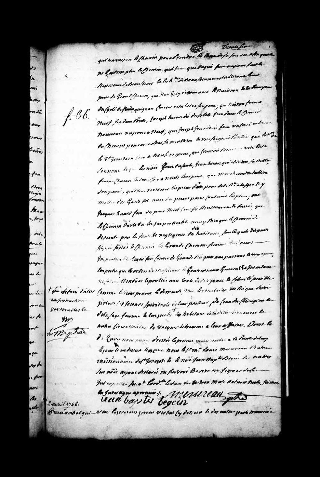 Procès-verbal de Jean-Eustache Lanouillier de Boiscler qui ordonne à tous les habitants de Saint-Joseph, seigneurie de Lauzon, qui ont sur leurs terres de mauvais ponts, et notamment aux dénommés au procès-verbal précédent, de tirer incessamment les bois nécessaires pour la construction et réparation d'iceux, 2 avril 1746, Archives nationales à Québec, Fonds Grands voyers, (03Q,E2,S1,D150,P392).