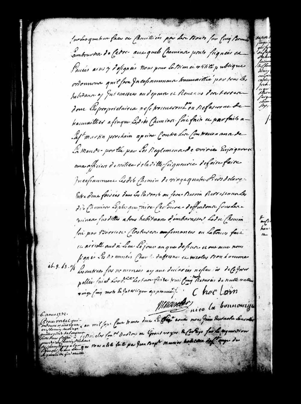 Procès-verbal de Jean-Eustache Lanouillier de Boiscler qui marque un chemin de vingt-quatre pieds de largeur entre les deux fossés, à prendre au chemin d'en haut de Champigny, à la ligne qui sépare la seigneurie de Gaudarville de celle de Maure ou Saint-Augustin, jusqu'à la ligne qui sépare la terre du nommé Fafard de celle de Alexandre Trudel, et qui ordonne l'entretien des ponts, saignées et fossés chacun en droit soi, 6 août 1732, Archives nationales à Québec, Fonds Grands voyers, (03Q,E2,S1,D150,P459).