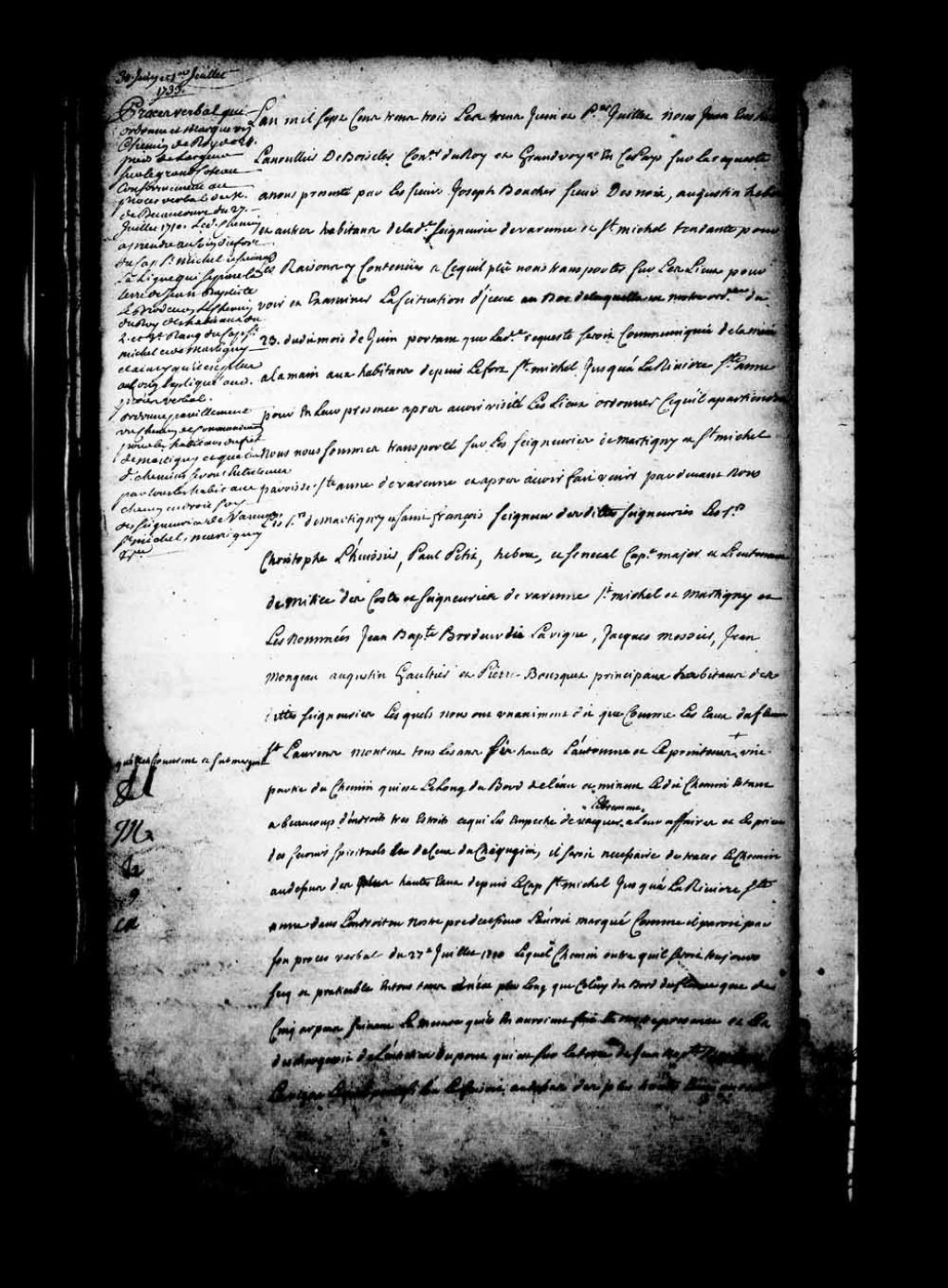 Procès-verbal de Jean-Eustache Lanouillier de Boiscler qui marque un chemin de Roi de vingt-quatre pieds de largeur dans la seigneurie de Varennes et Saint-Michel, sur le Grand-Coteau, conformément au procès-verbal de M. Robineau de Bécancour du 27 juillet 1710, le dit chemin à prendre au coin du fort du Cap-Saint-Michel ensuivant la ligne qui sépare la terre de Jean-Baptiste Le Brodeur, et le chemin de Roi des habitants des deuxième et troisième rangs du Cap-Saint-Michel et de Martigny, et qui ordonne un chemin de communication pour les habitants du fief de Martigny, les dits chemins à être entretenus par tous les habitants des seigneuries de Varennes, Cap-Saint-Michel et Martigny