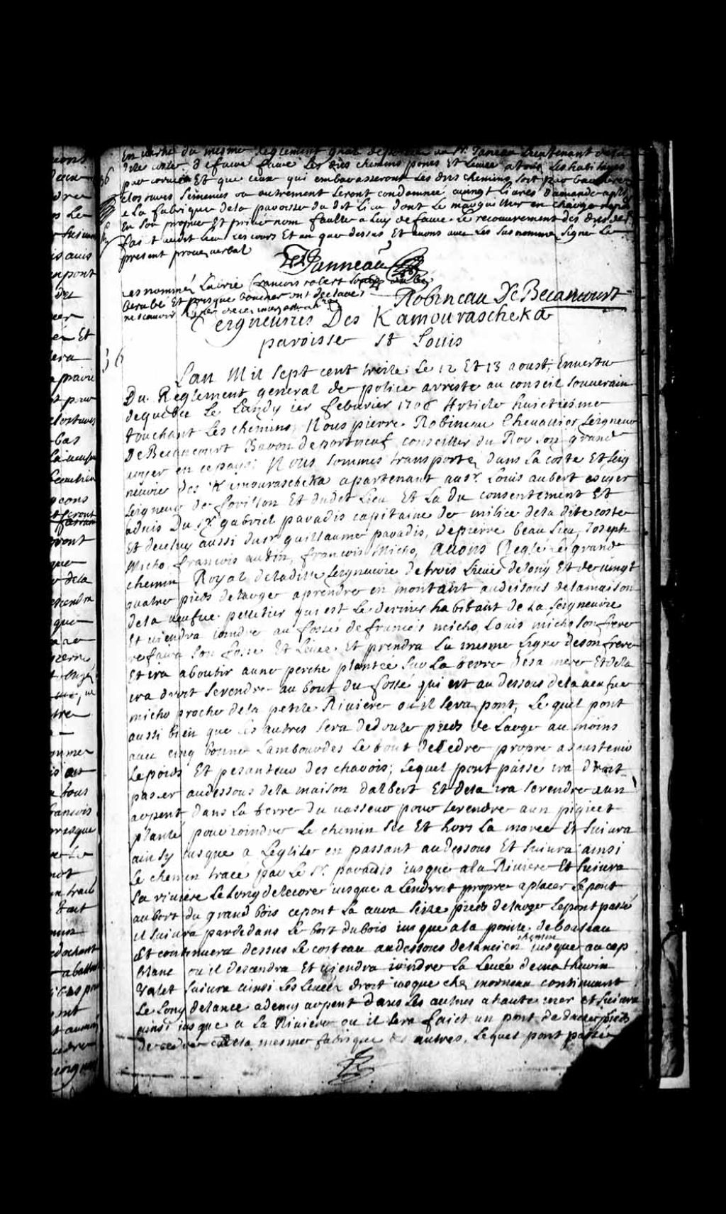 Procès-verbal de Pierre Robineau de Bécancour pour le grand chemin de la côte et seigneurie de Kamouraska, paroisse Saint-Louis, appartenant au Sieur Louis Aubert du Forillon, 12 août 1713-13 août 1713, Archives nationales à Québec, Fonds Grands voyers, (03Q,E2,S1,D150,P48).