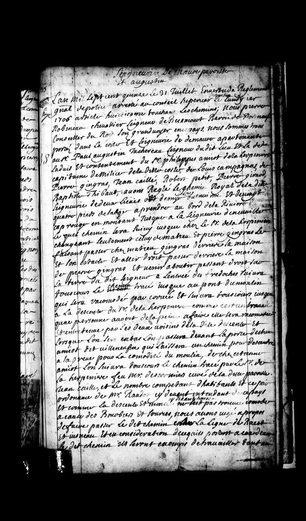 Procès-verbal de Pierre Robineau de Bécancour pour le grand chemin royal de la côte et seigneurie de Maure, paroisse Saint-Augustin, appartenant au Sieur Paul-Augustin Juchereau de Maure, 31 juillet 1715, Archives nationales à Québec, Fonds Grands voyers, (03Q,E2,S1,D150,P51).