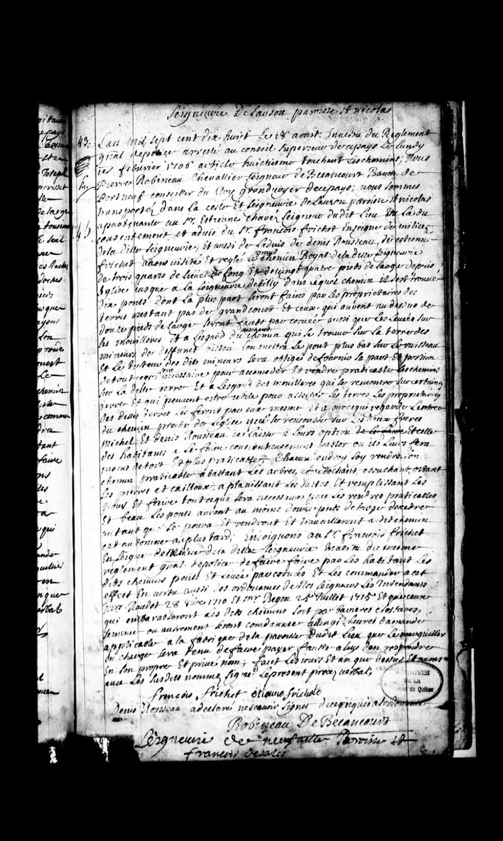 Procès-verbal de Pierre Robineau de Bécancour pour le grand chemin royal de la paroisse de Saint-Nicolas, seigneurie de Lauzon, appartenant au Sieur Étienne Charest, 18 août 1718, Archives nationales à Québec, Fonds Grands voyers, (03Q,E2,S1,D150,P58).