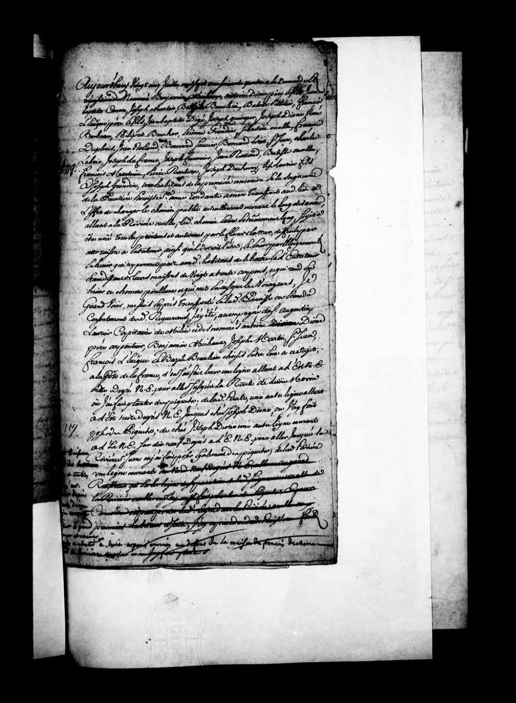 Procès-verbal de François-Joseph Cugnet qui transporte une partie du chemin de Roi de la seigneurie de la Pocatière, paroisse Sainte-Anne (Sainte-Anne-de-la-Pocatière), rang du Bord de l'eau, plus au sud parce que le dit chemin est noyé, printemps et automne, par la mer, ce qui le rend difficile d'entretien et dangereux pour ceux qui y passent, 25 juillet 1764, Archives nationales à Québec, Fonds Grands voyers, (03Q,E2,S1,D150,P595).