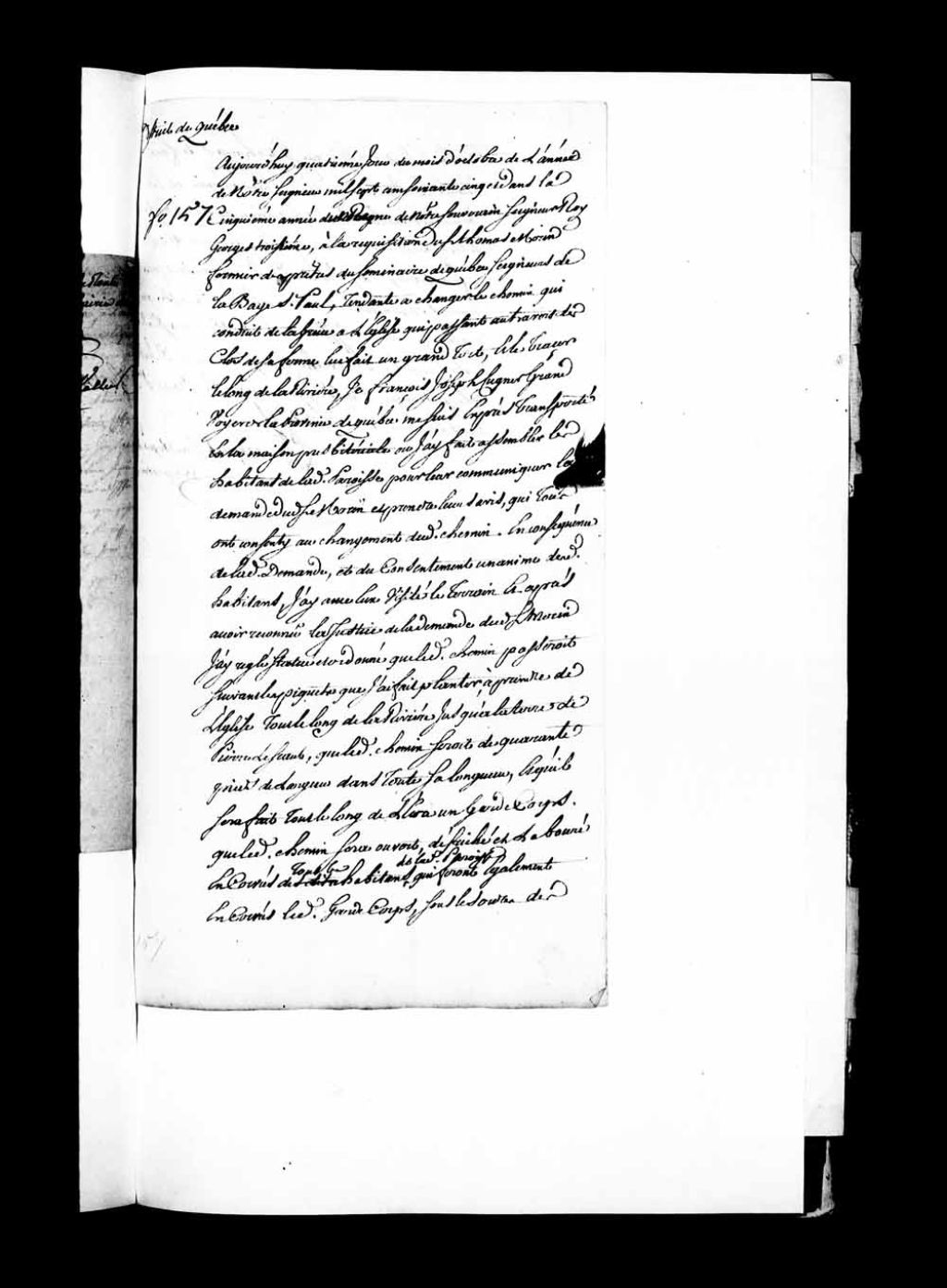 Procès-verbal de François-Joseph Cugnet qui change le chemin de Roi qui conduit de la grève à l'église de la Baie Saint-Paul, parce que le dit chemin passant au travers le clos de la ferme des Messieurs du séminaire de Québec leur fait grandement tort, 4 octobre 1765, Archives nationales à Québec, Fonds Grands voyers, (03Q,E2,S1,D150,P615).
