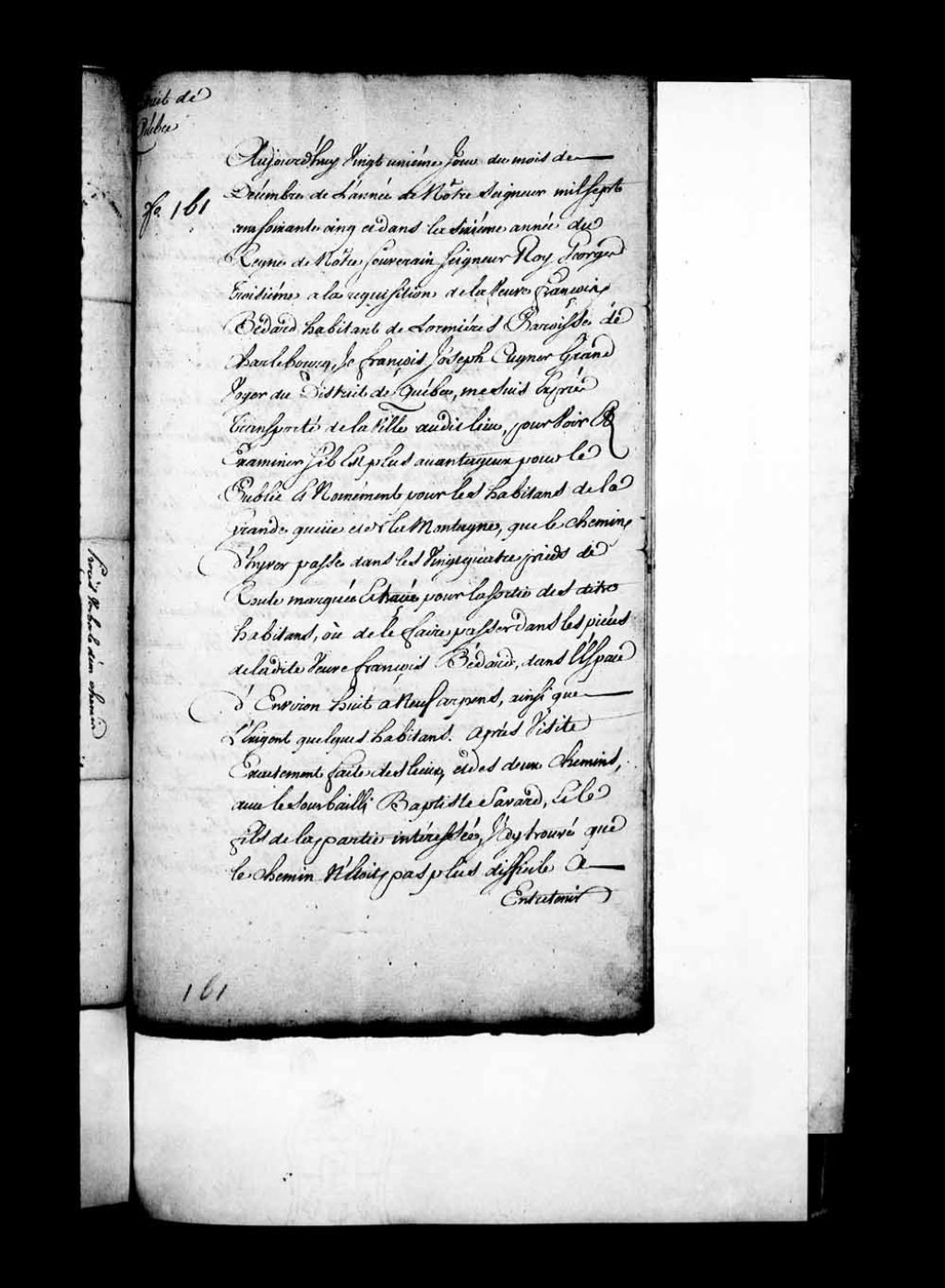 Procès-verbal de François-Joseph Cugnet au sujet d'un chemin d'hiver dans la côte de Lormière, paroisse de Charlesbourg, 21 décembre 1765, Archives nationales à Québec, Fonds Grands voyers, (03Q,E2,S1,D150,P618).