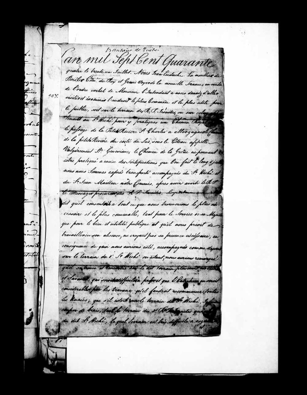 Procès-verbal de Jean-Eustache Lanouillier de Boiscler au sujet de la construction d'un chemin royal depuis le passage de la Petite Rivière Saint-Charles jusqu'au chemin de la Petite Rivière du côté du sud, sous le coteau appelé vulgairement Sainte-Geneviève, en vertu de l'ordre verbal de l'intendant Hocquart, "le chemin de la grève ne pouvant être pratiqué à cause des fortifications que l'on fait le long d'icelle", 31 juillet 1744, Archives nationales à Québec, Fonds Grands voyers, (03Q,E2,S1,D150,P649).