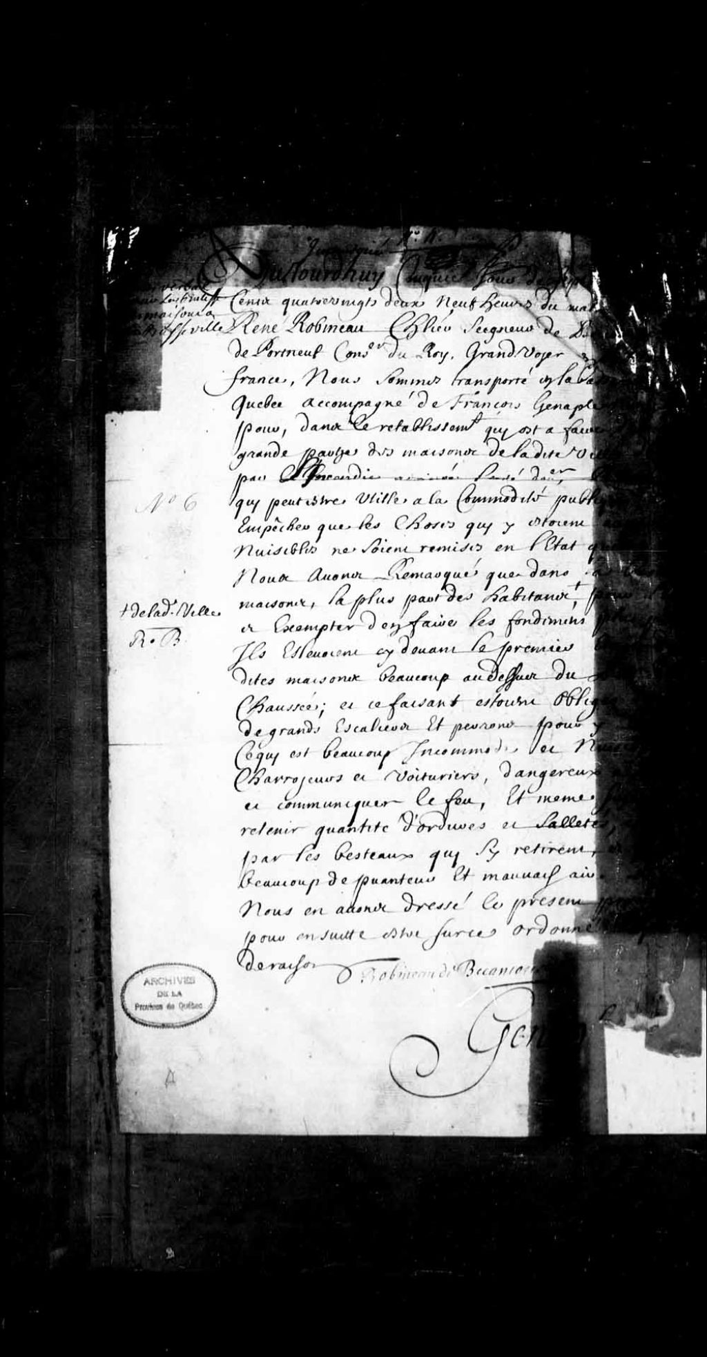 Procès-verbal de René Robineau de Bécancour de la visite qu'il a faite à la basse ville de Québec incendiée l'été dernier pour "pourvoir à ce qui peut-être utile à la commodité publique et empêcher que les choses qui y étaient auparavant nuisibles ne soient remises en l'état qu'elles étaient", 5 septembre 1682, Archives nationales à Québec, Fonds Grands voyers, (03Q,E2,S1,D150,P661).