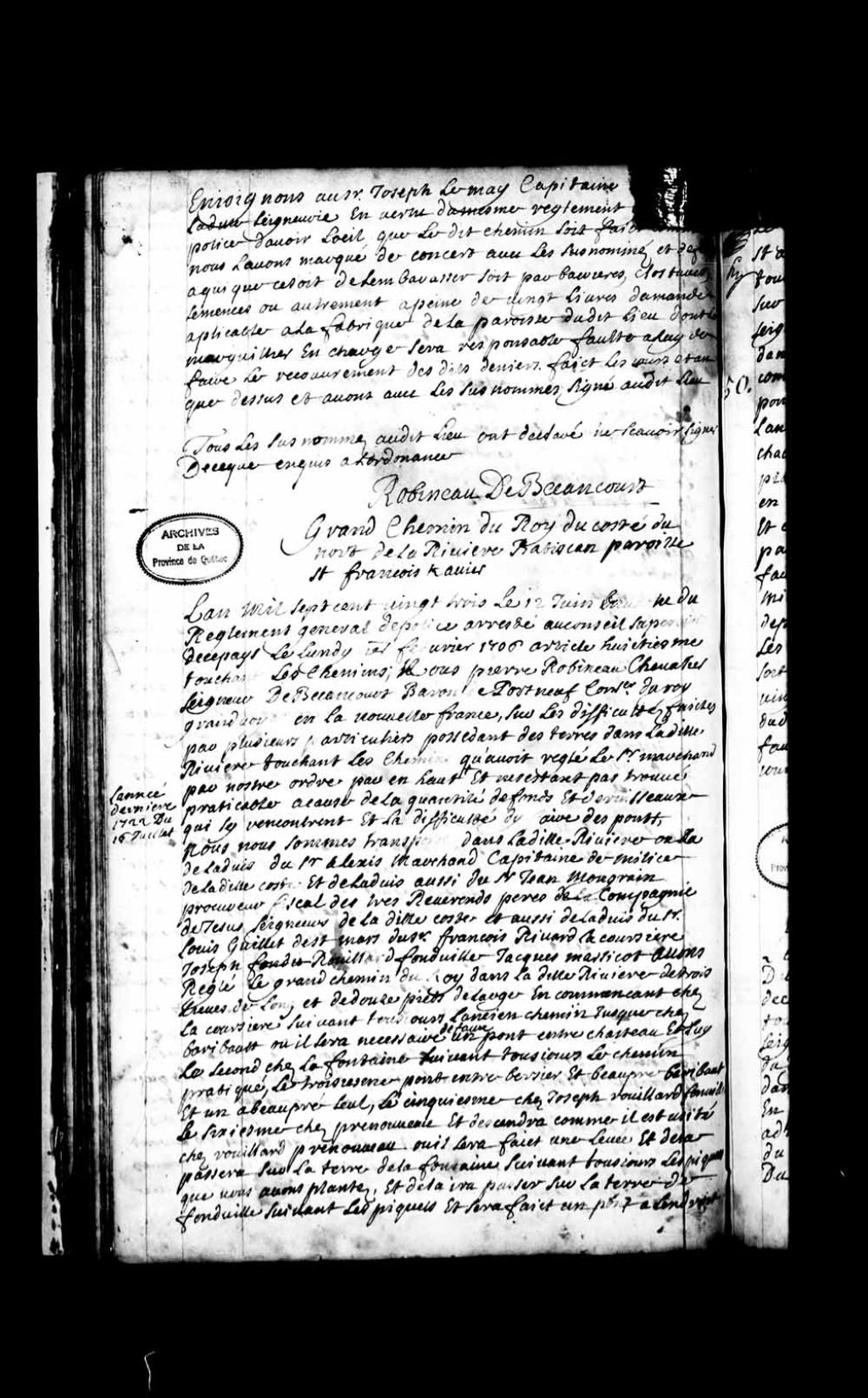 Procès-verbal de Pierre Robineau de Bécancour pour le grand chemin du Roi du côté du nord de la rivière Batiscan, paroisse Saint-François-Xavier, 12 juin 1723, Archives nationales à Québec, Fonds Grands voyers, (03Q,E2,S1,D150,P68).