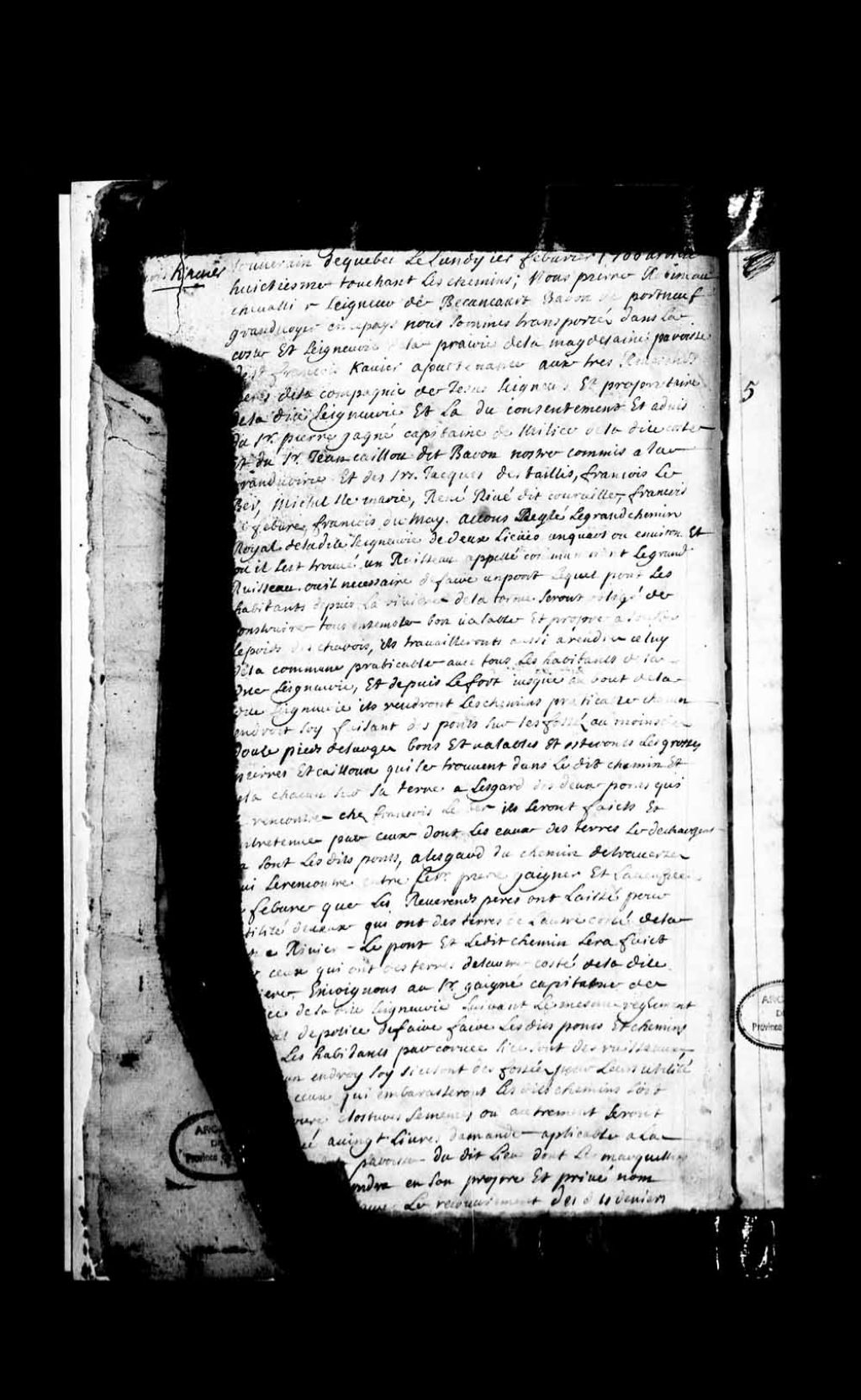 Procès-verbal de Pierre Robineau de Bécancour pour le grand chemin de la côte et seigneurie de La-Prairie-de-la-Madeleine, paroisse Saint-François-Xavier, appartenant aux Révérends Pères Jésuites, 9 août 1708, Archives nationales à Québec, Fonds Grands voyers, (03Q,E2,S1,D150,P7).
