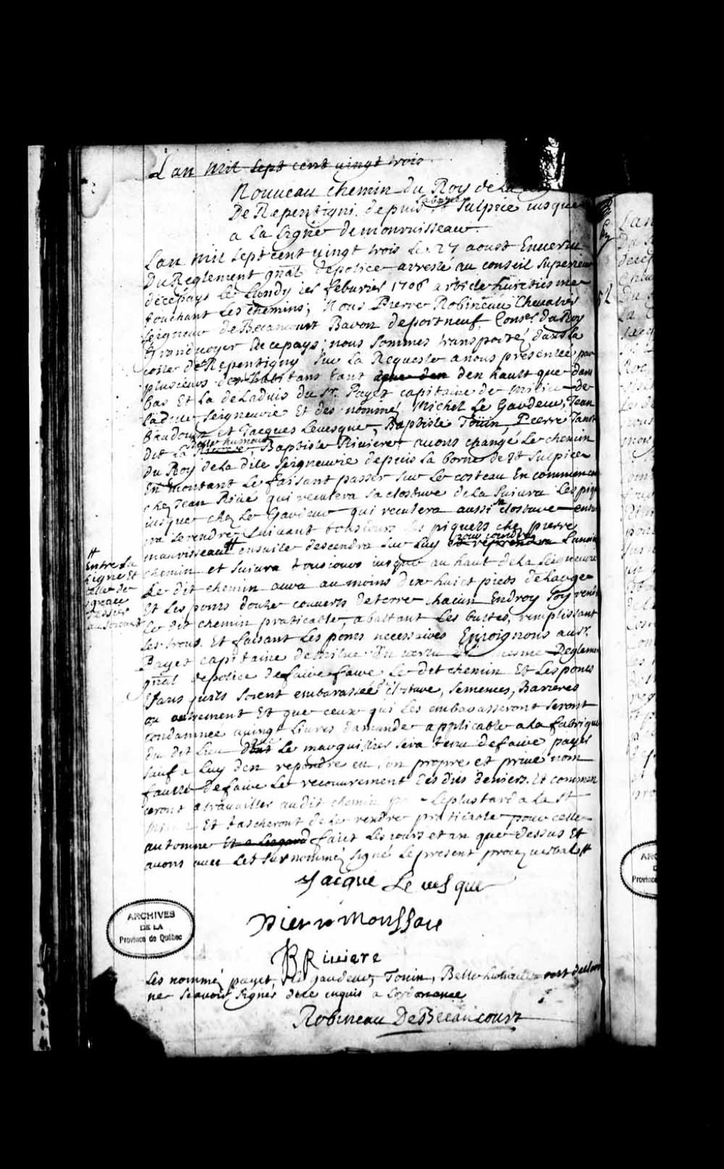 Procès-verbal de Pierre Robineau de Bécancour pour le nouveau chemin du Roi de la côte et seigneurie de Repentigny