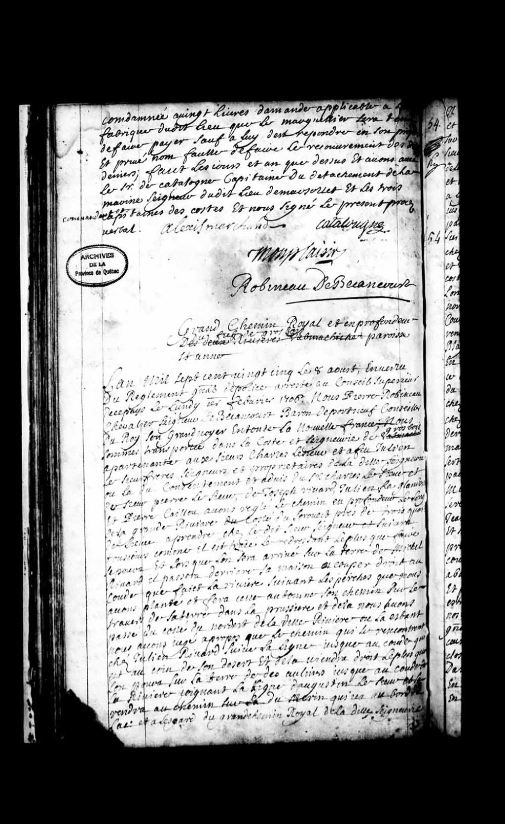 Procès-verbal de Pierre Robineau de Bécancour pour le grand chemin du Roi en profondeur de la côte et seigneurie de Grosbois, appartenant au Sieur Charles Lesieur, à feu Julien Lesieur et à leurs frères