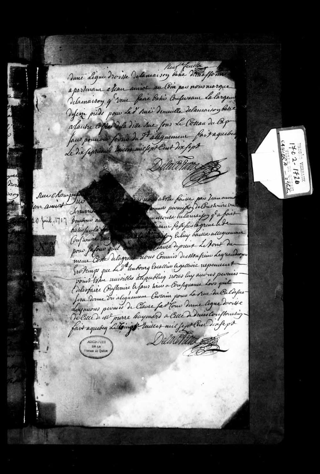 Procès-verbal d'alignement donné par Florent de Lacetière, commis à cet effet par le grand voyer, à Jean Amiot, serrurier, pour la cour de sa maison rue Champlain, avec permission de construire un tambour avec un escalier pour arriver à la dite maison