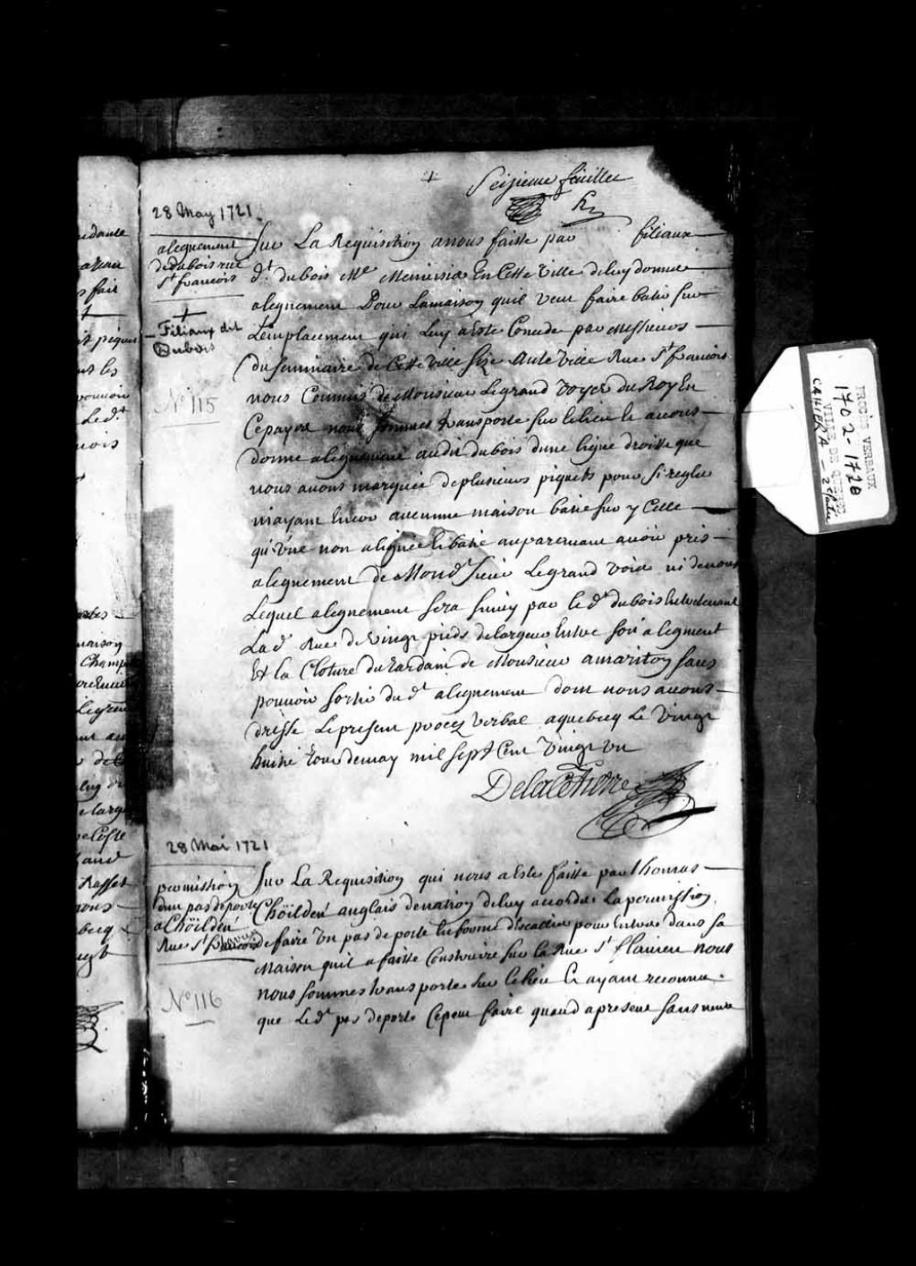 Procès-verbal de Florent de Lacetière, commis à cet effet par le grand voyer, qui donne permission à Thomas Choiden, anglais de nation, de faire un pas de porte en forme d'escalier pour entrer dans sa maison, rue Saint-Flavien, à Québec, 28 mai 1721, Archives nationales à Québec, Fonds Grands voyers, (03Q,E2,S1,D150,P771).