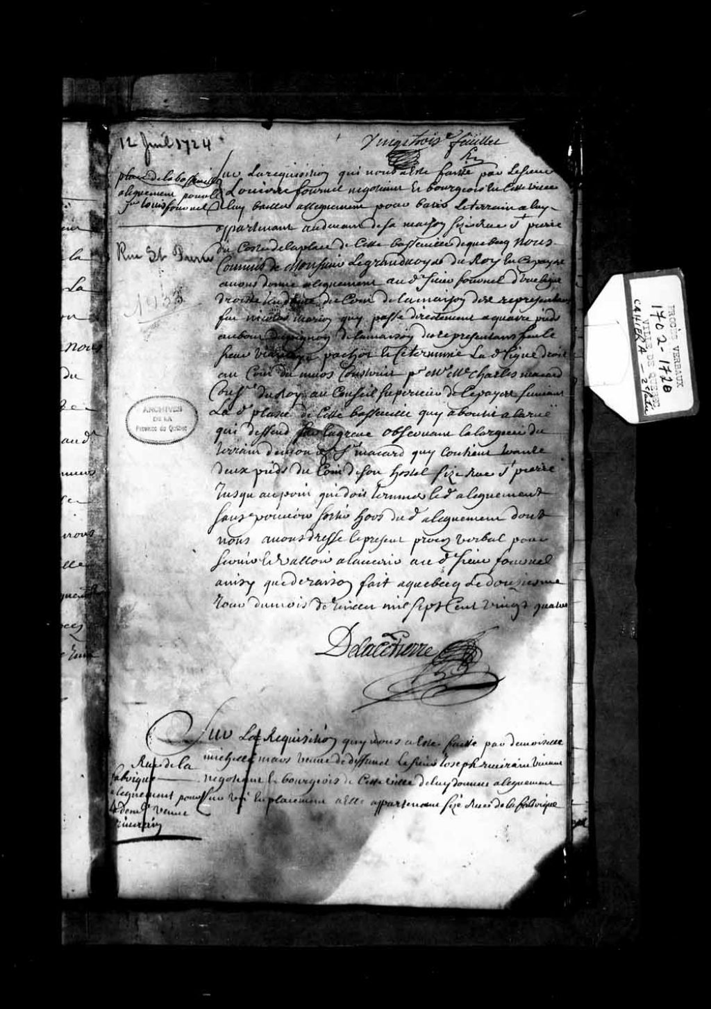 Procès-verbal d'alignement donné par Florent de Lacetière, commis à cet effet par le grand voyer, à Michelle Mars, veuve de Joseph Riverin, vivant négociant et bourgeois, pour l'emplacement à elle appartenant, rue de la Fabrique