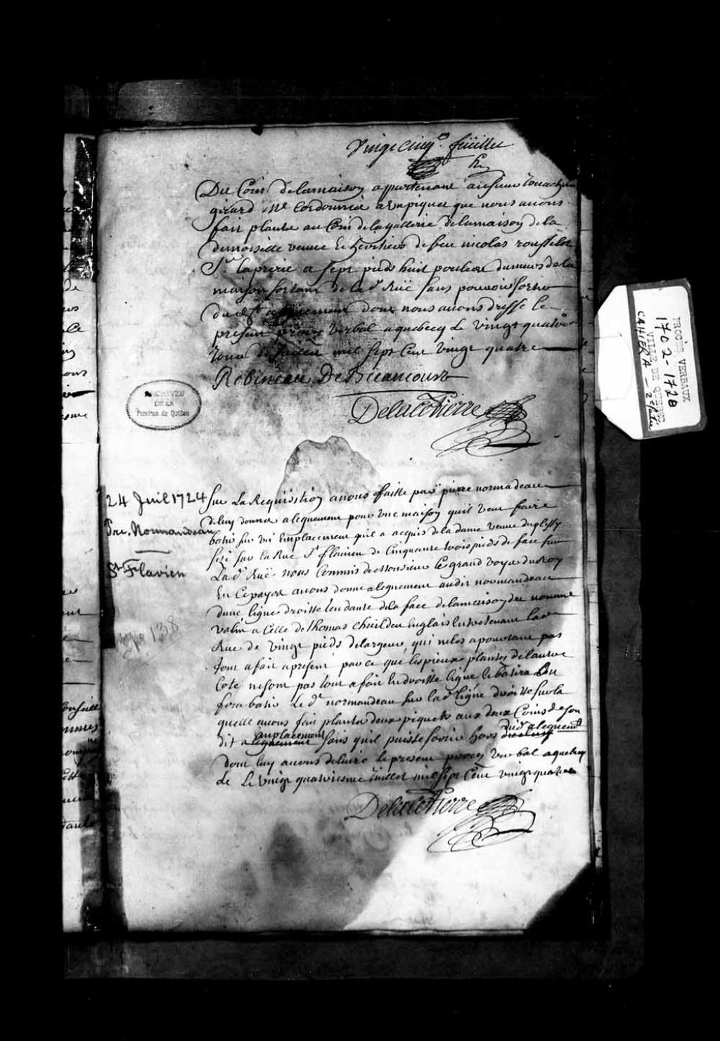 Procès-verbal d'alignement donné par Florent de Lacetière, commis à cet effet par le grand voyer, à Pierre Normandeau, pour une maison qu'il veut faire bâtir, rue Saint-Flavien, sur un emplacement de cinquante-trois pieds de front qu'il a acquis de la veuve Duplessis, 24 juillet 1724, Archives nationales à Québec, Fonds Grands voyers, (03Q,E2,S1,D150,P794).