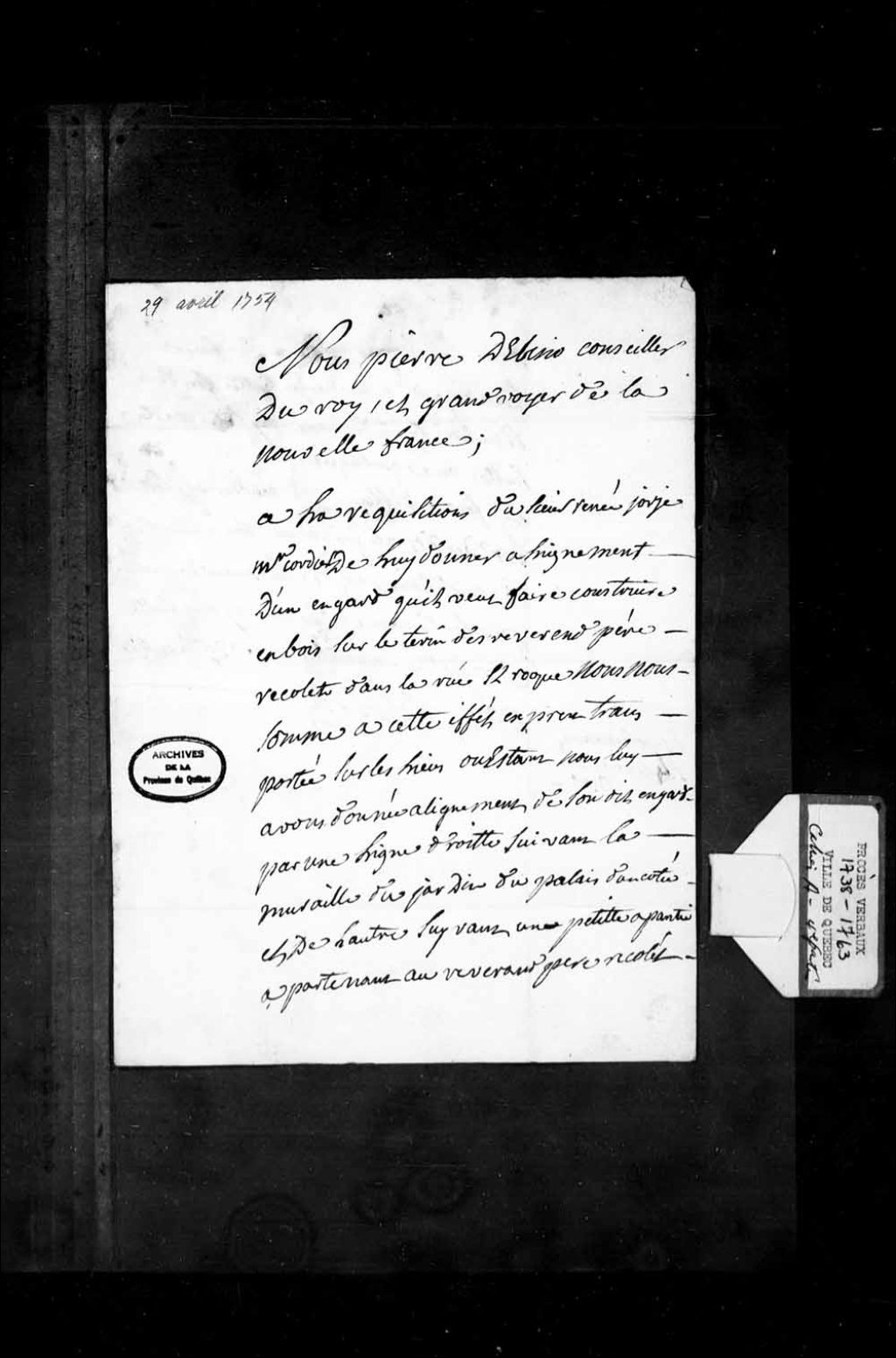 Procès-verbal d'alignement donné par Pierre Martin de Lino au Sieur René Jorge (?), maître cordier, pour un hangar qu'il veut construire sur le terrain des Pères Récollets, rue Saint-Roch, à Québec, 29 avril 1754, Archives nationales à Québec, Fonds Grands voyers, (03Q,E2,S1,D150,P893).