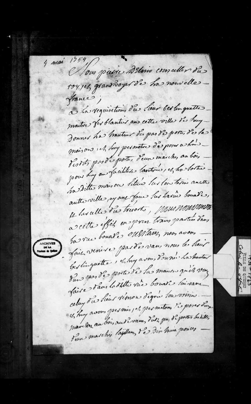 Procès-verbal de Pierre Martin de Lino qui permet au Sieur Berlinguet, maître ferblantier, de placer un pas de porte devant sa maison, rue Buade, 4 mai 1754, Archives nationales à Québec, Fonds Grands voyers, (03Q,E2,S1,D150,P894).