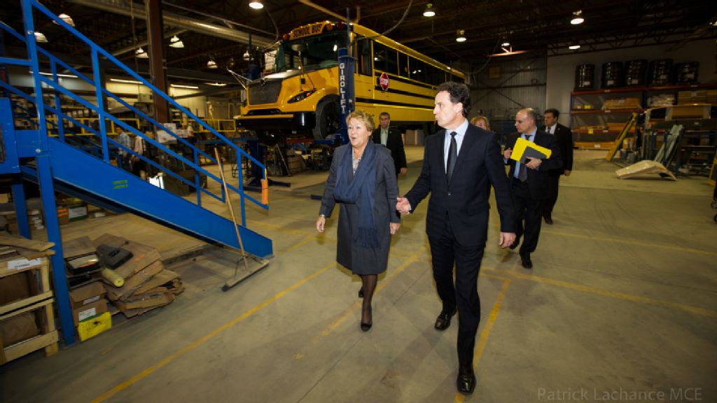 - Québec, le 8 novembre 2013 ¿ La première ministre du Québec, Pauline Marois, accompagnée de la ministre des Ressources naturelles, Martine Ouellet, et de l¿adjoint parlementaire à la première ministre ¿ volet électrification des transports, Daniel Breton, annonce l¿attribution d¿une aide financière de 675 000 $ à l¿entreprise Autobus Lion inc. pour un projet de développement d¿un autobus scolaire entièrement électrique. Ce projet s¿inscrit dans le sillage de la Politique économique Priorité emploi et de la Stratégie d¿électrification des transports, récemment rendues publiques par le gouvernement.Source: Direction des Communications, ministère du Conseil exécutif