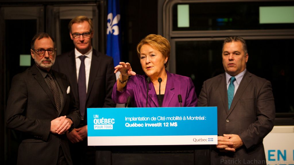 - Montréal, le 22 novembre 2013 ¿ La première ministre du Québec, Pauline Marois, accompagnée de son adjoint parlementaire pour le volet électrification des transports, Daniel Breton, du président et chef de la direction du Groupe Volvo, Olof Persson, et du président du conseil d¿administration de la Société de transport de Montréal, Michel Labrecque, a annoncé aujourd¿hui une aide financière de près de 12 M$ pour un projet pilote novateur qui dotera la métropole québécoise d¿autobus entièrement électriques, utilisant une méthode de recharge à la fine pointe de la technologie et fabriqués au Québec par Nova Bus. Les autobus circuleront dans les rues de Montréal à partir de 2015, et ce, pendant trois ans.Source: Direction des Communications, ministère du Conseil exécutif