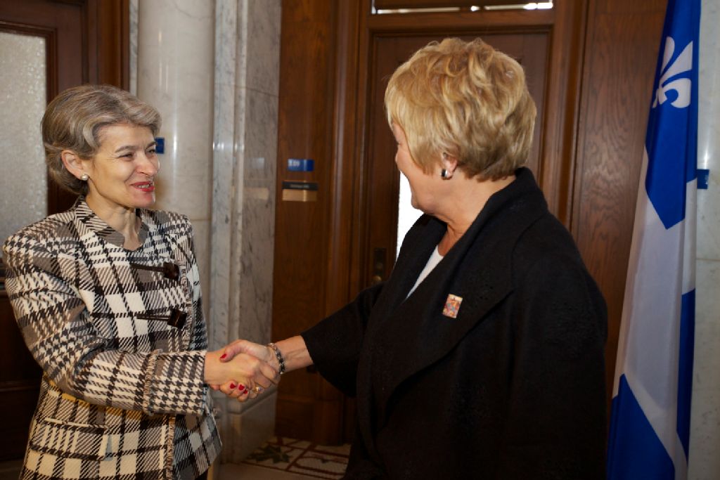 - Québec, le jeudi 7 mars 2013 ¿ La première ministre Pauline Marois a eu un entretien chaleureux ce matin avec la directrice générale de l¿UNESCO, Irina Bokova, de passage dans la capitale pour recevoir un doctorat honoris causa de l¿Université Laval. Au cours de l¿entretien privé, Mme Marois a confirmé à la directrice générale que le Québec entend poursuivre sa participation aux travaux de l¿UNESCO, même si le gouvernement du Québec n¿est pas un État membre à part entière de cette organisation.Source: Direction des Communications, ministère du Conseil exécutif
