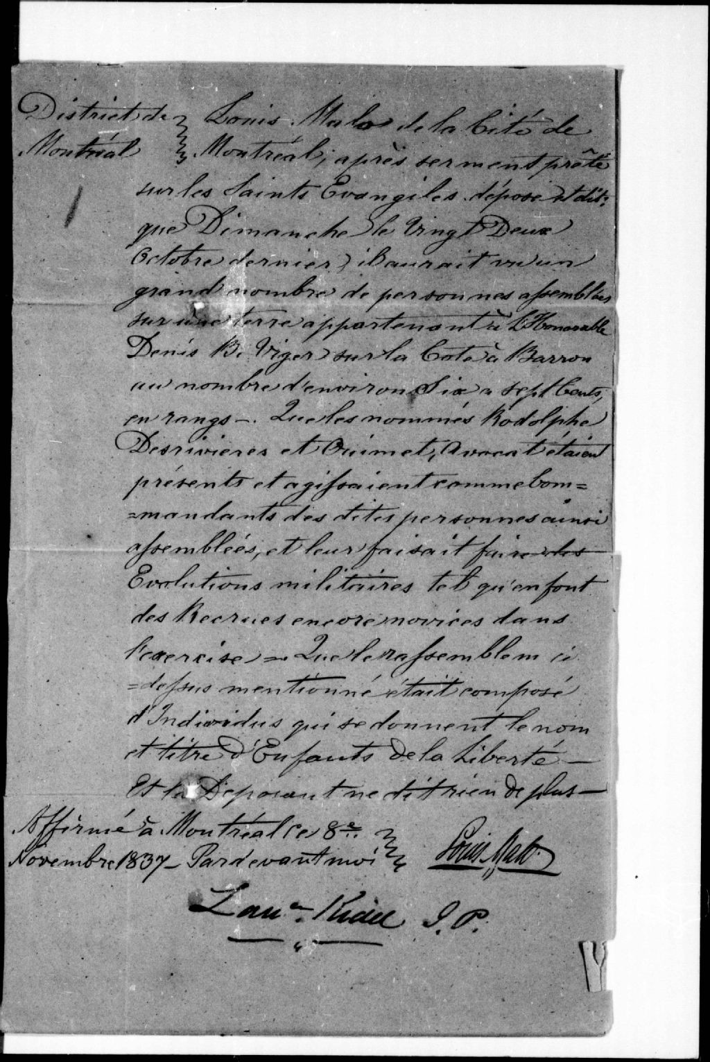 Affidavit de Louis Malo, de Montréal, 8 novembre 1837, Archives nationales à Québec, Fonds Ministère de la Justice, (03Q,E17,S37,D1).