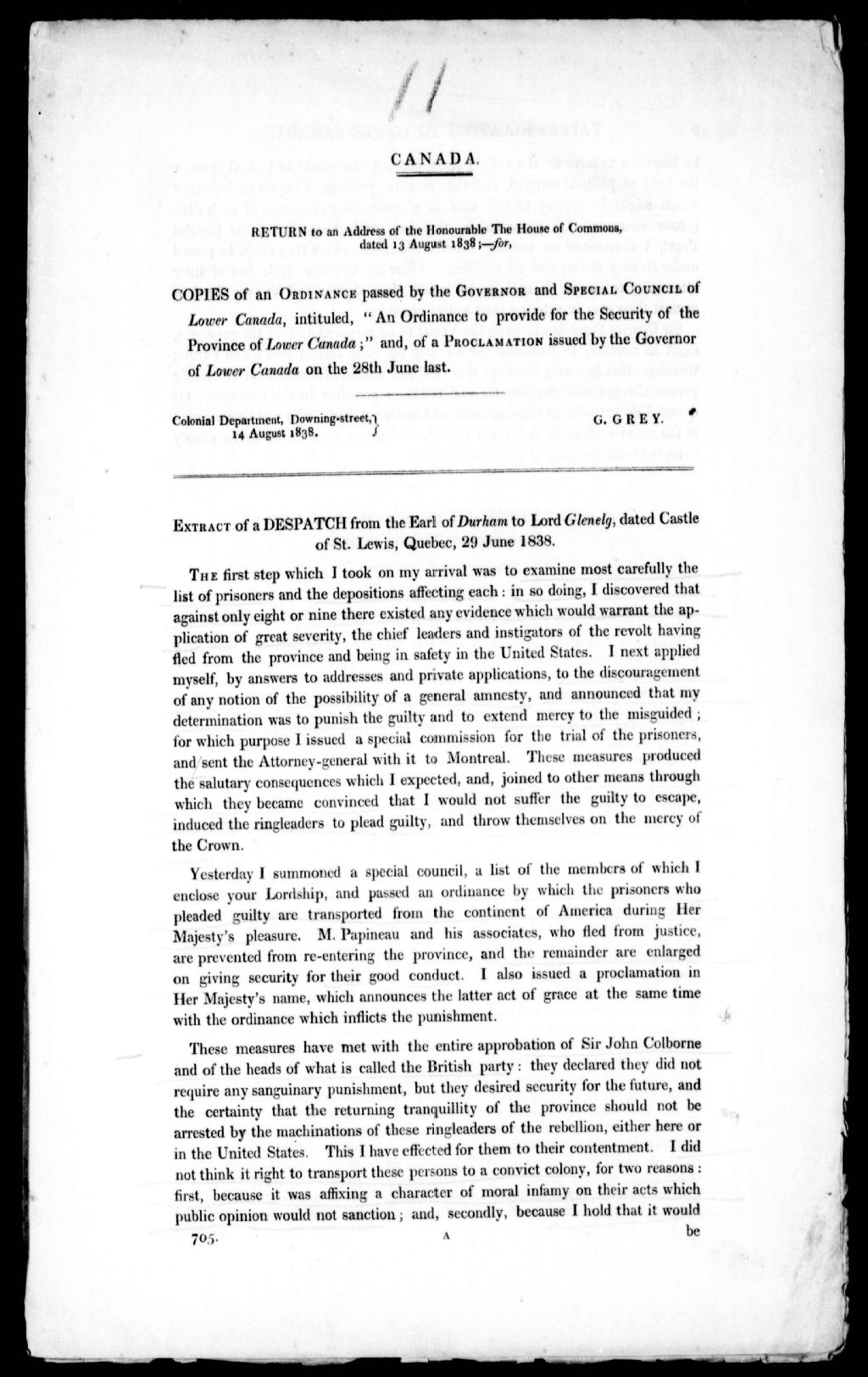 Copie d'une ordonnance passée par le gouverneur et le Conseil spécial du Canada, et d'une proclamation de Lord Durham, 28 juin 1838, Archives nationales à Québec, Fonds Ministère de la Justice, (03Q,E17,S37,D10011).