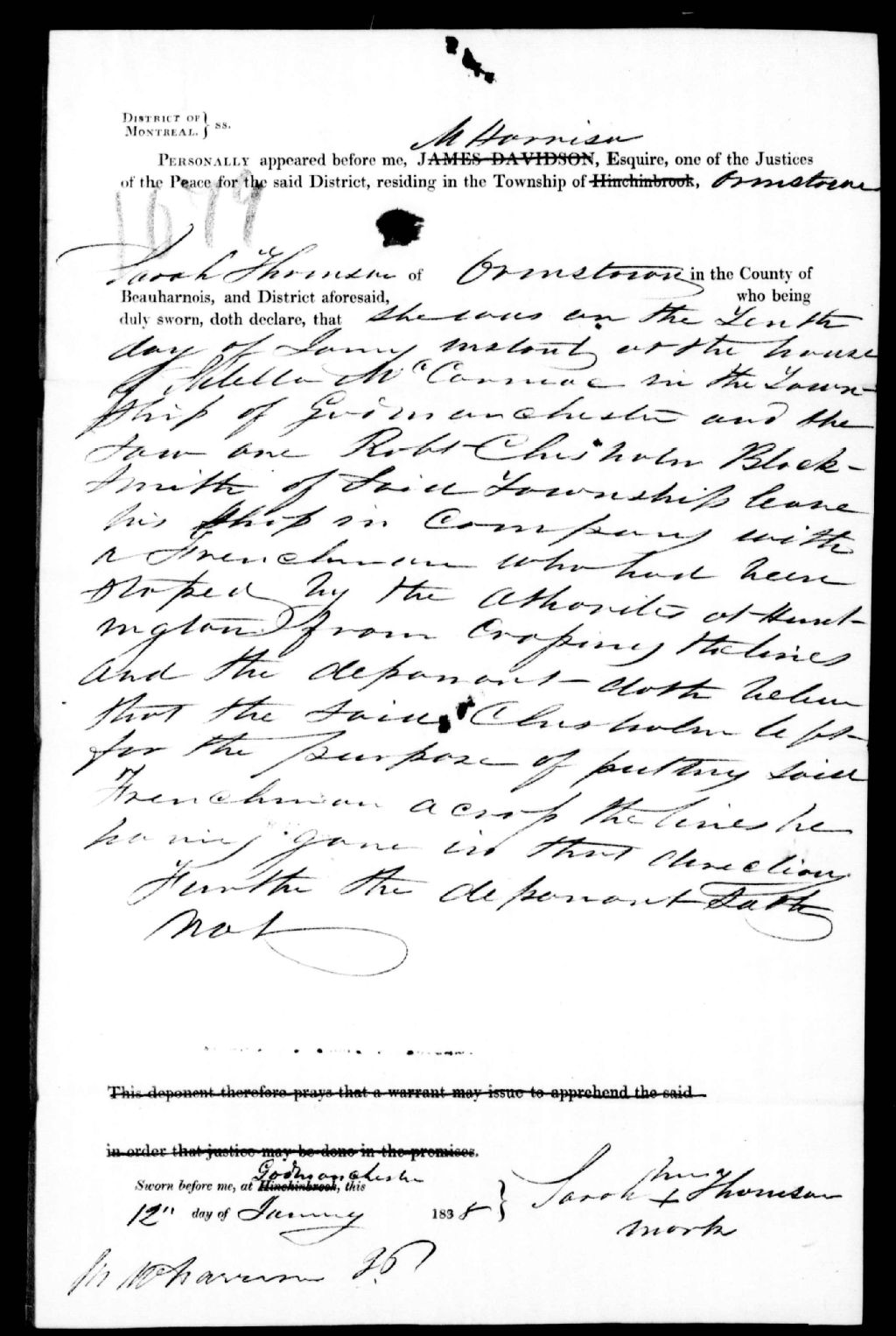 Déposition de Sarah Thomson, d'Ormstown, contre Robert Chisholm, 1er février 1838, Archives nationales à Québec, Fonds Ministère de la Justice, (03Q,E17,S37,D1079).