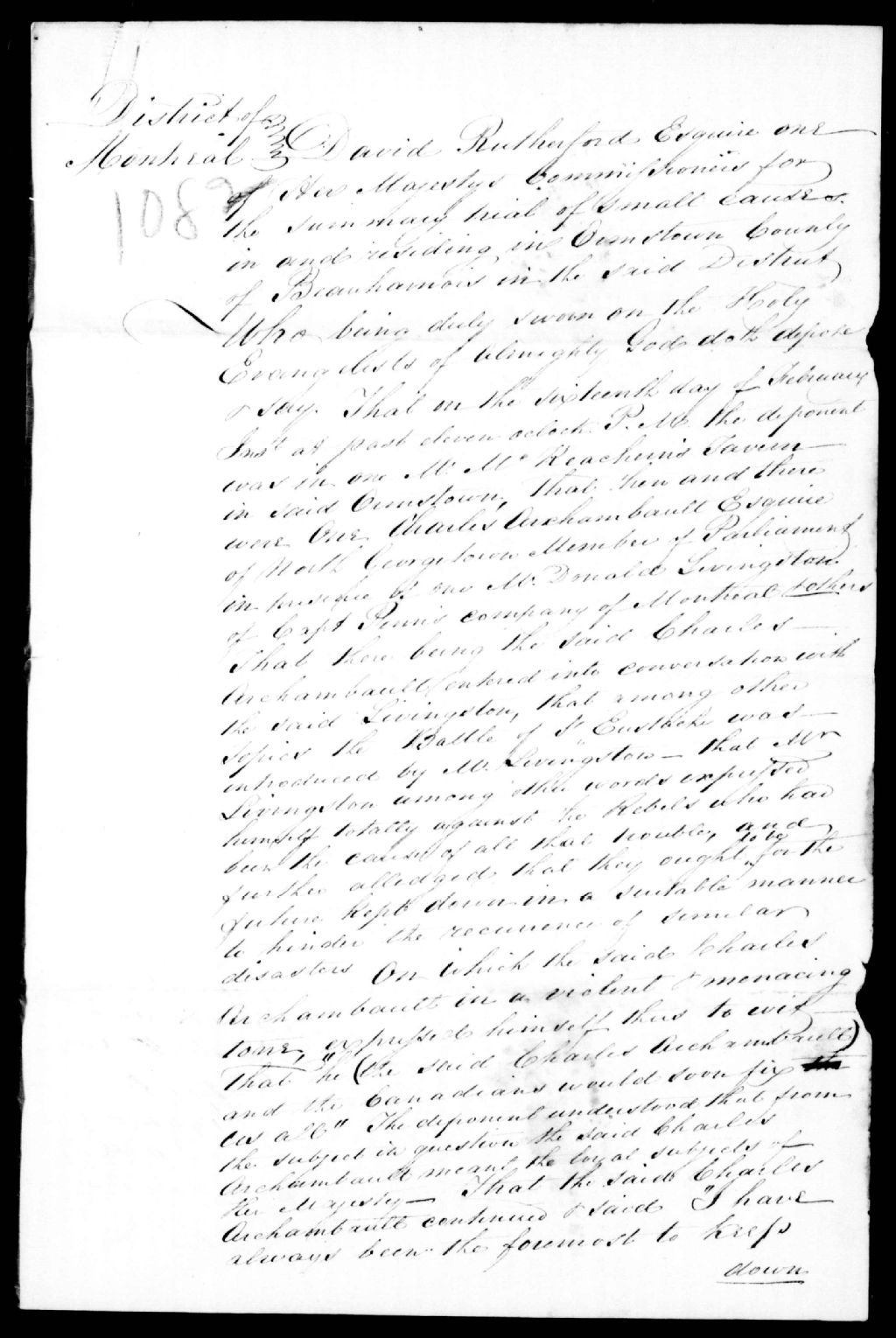 Déposition de David Rutherford, d'Ormstown, contre Charles Archambault, membre du Parlement, 24 février 1838, Archives nationales à Québec, Fonds Ministère de la Justice, (03Q,E17,S37,D1082).