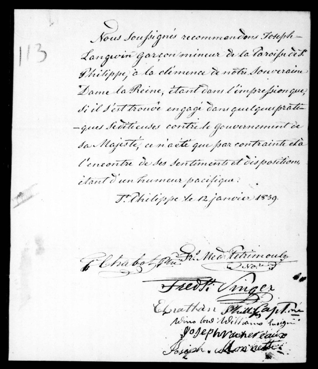 Requête de Grégoire Chabot, ptre., Frédéric Singer, François-Médéric Pétrimoulx, notaire, E.Phillps, capitaine, W.L.William, enseigne, Joseph ?, et Joseph Monette, tous de Saint-Philippe, en faveur de Joseph Langevin fils, garçons mineur, de Saint-Philippe, 12 janvier 1837, Archives nationales à Québec, Fonds Ministère de la Justice, (03Q,E17,S37,D113).