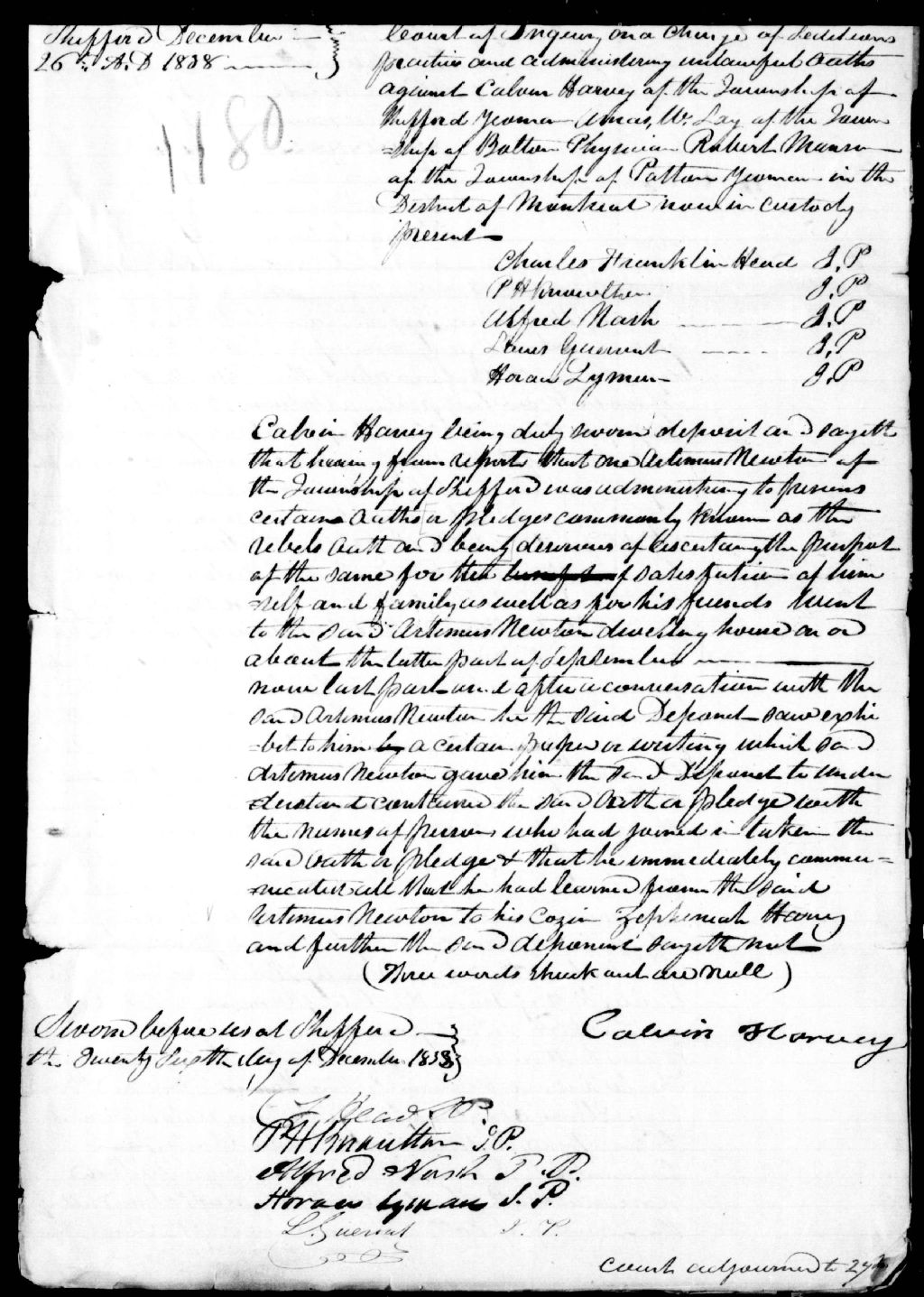 Commission d'enquête sur les accusations portées contre Calvin Harvey, de Shefford, Amos Lay, Robert Manson, Artemius Newton. Détails intéressants sur l'administration du serment secret dans les cantons de l'Est