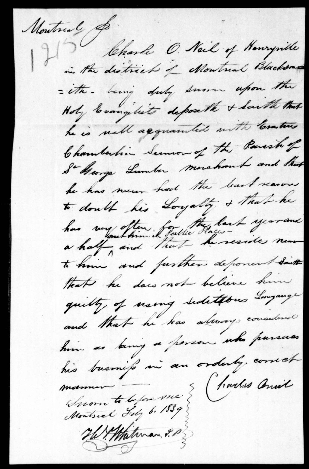 Déposition en faveur d'Erastus Chamberlain, de Saint-Georges, par Charles O'Neil, de Henryville, 6 février 1839, Archives nationales à Québec, Fonds Ministère de la Justice, (03Q,E17,S37,D1215).