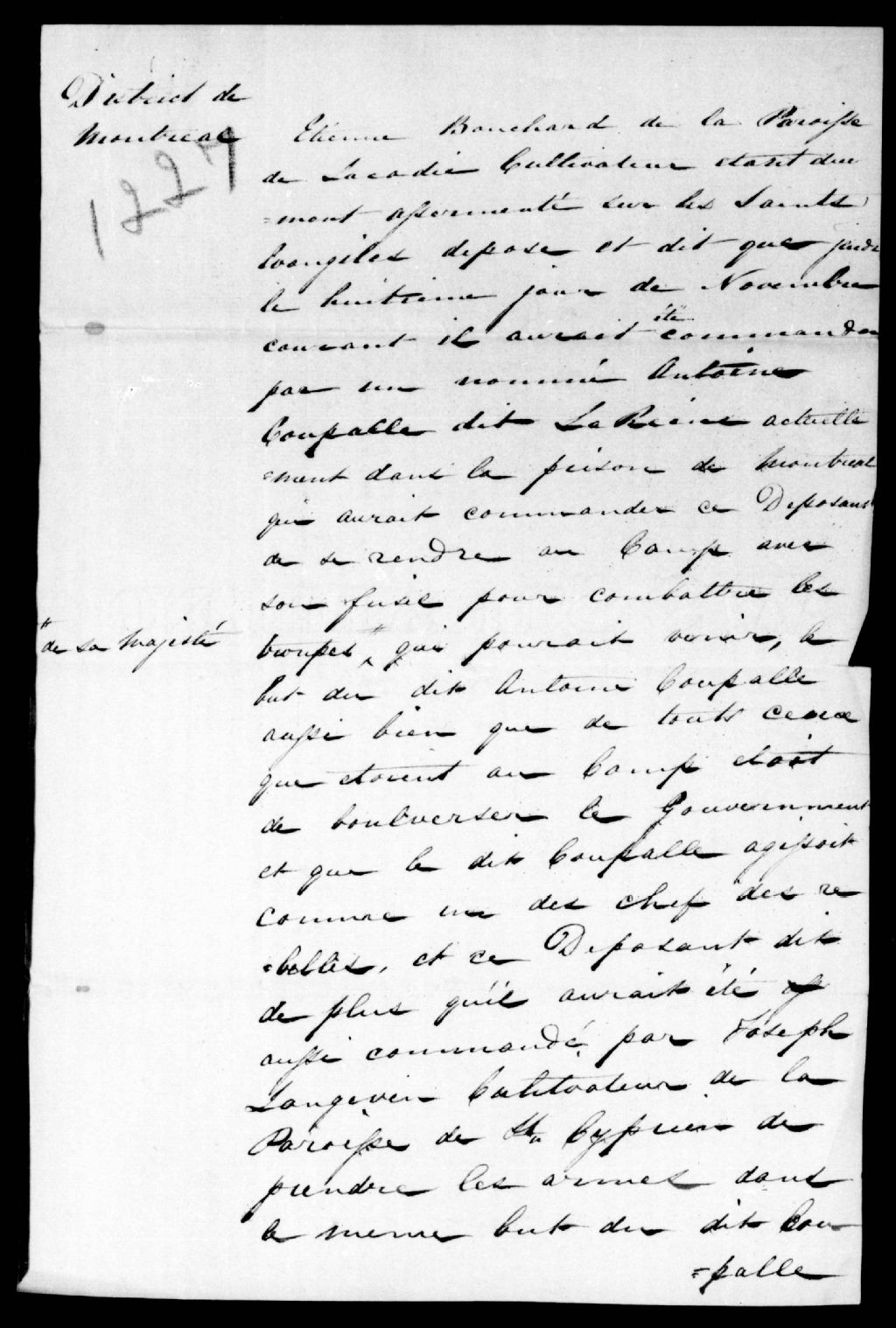 - Déposition d'Étienne Bouchard, de l'Acadie, contre Antoine Coupal dit Lareine