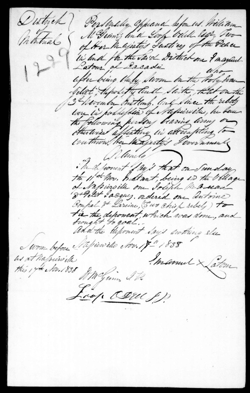 Déposition d'Emmanuel Latour contre Antoine Coupal dit La reine et Joseph Marceau dit Petit Jacques, 17 novembre 1838, Archives nationales à Québec, Fonds Ministère de la Justice, (03Q,E17,S37,D1229).