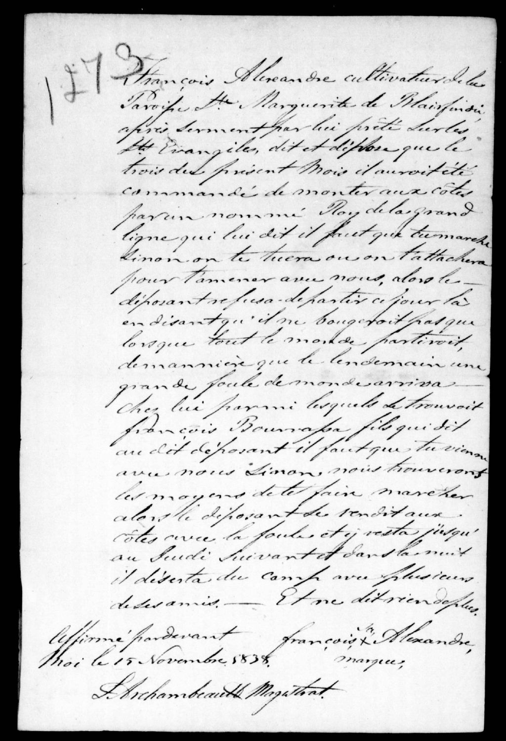 Déposition de François Alexandre contre Roi et François Bourassa, 15 novembre 1838, Archives nationales à Québec, Fonds Ministère de la Justice, (03Q,E17,S37,D1273).