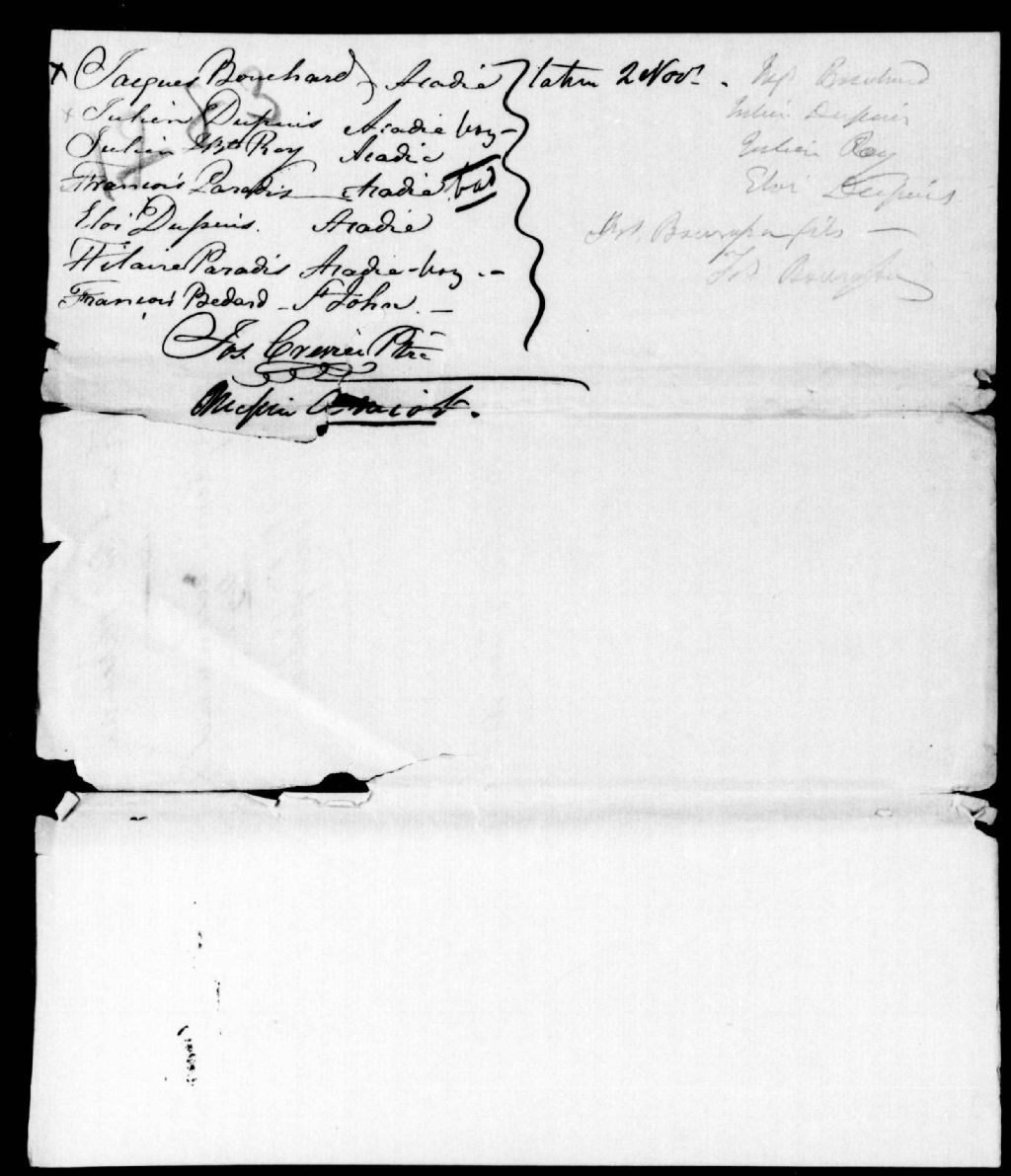 Liste de personnes recommandées par le révérend monsieur Jos.Crevier, curé de Saint-Hyacinthe : Jacques Bouchard, Julien Dupuis, Julien Jean Baptiste Roy, Francois Paradis, Éloi Dupuis, Hilaire Paradis, Francois Bédard, vers 1838, Archives nationales à Québec, Fonds Ministère de la Justice, (03Q,E17,S37,D1283).