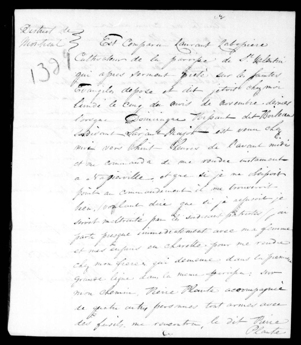 Déposition de Laurent Labossière contre Dominique Poissant dit Boileau et Pierre Plante, 8 décembre 1838, Archives nationales à Québec, Fonds Ministère de la Justice, (03Q,E17,S37,D1329).