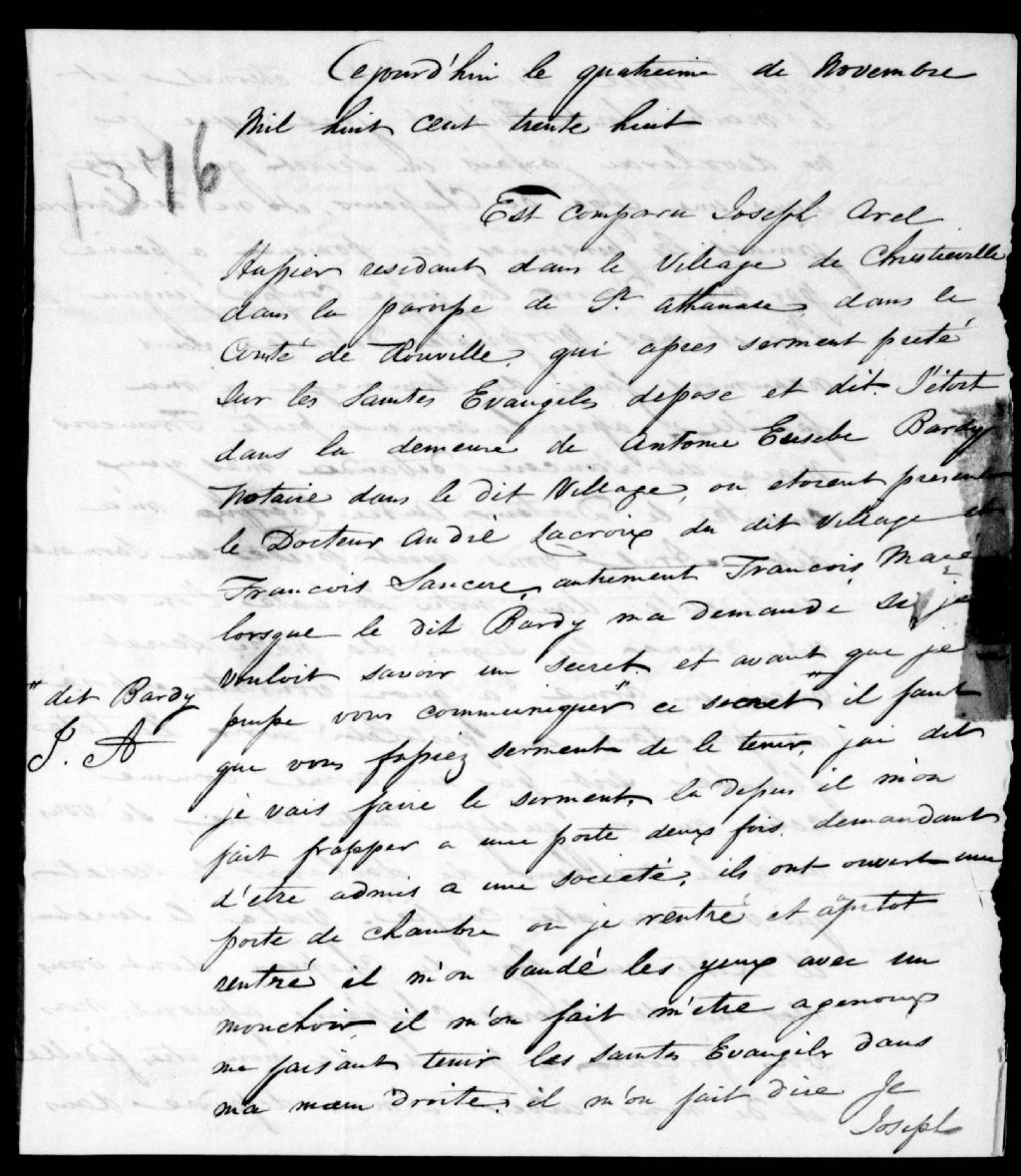 Déposition de Joseph Arel, de Christieville, contre Antoine-Eusèbe Bardy, le docteur André Lacroix, François Massé dit Sancerre